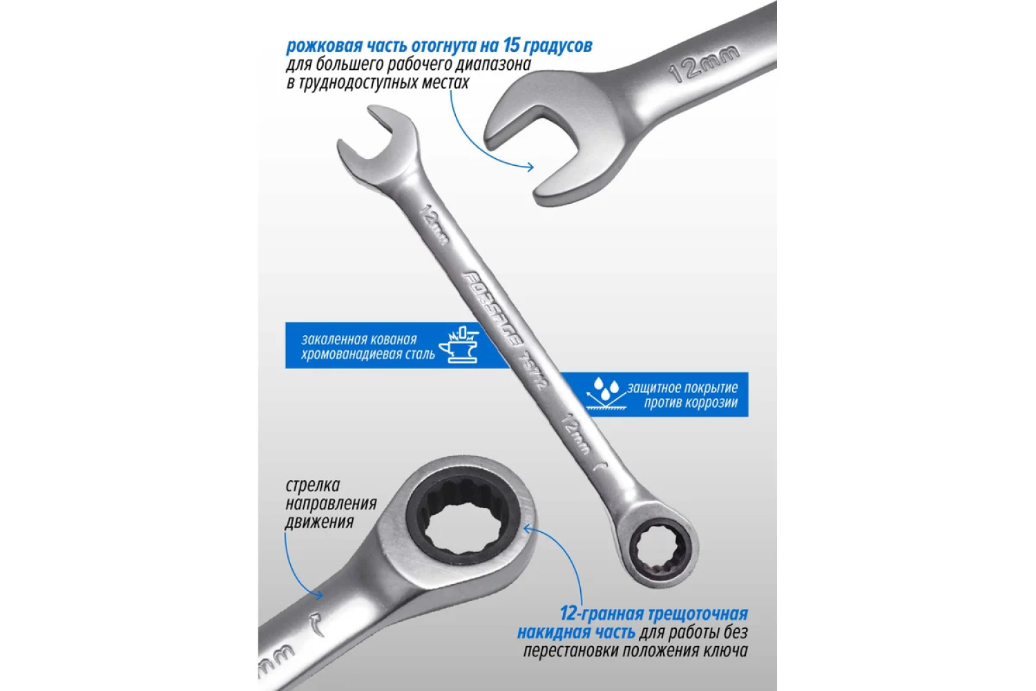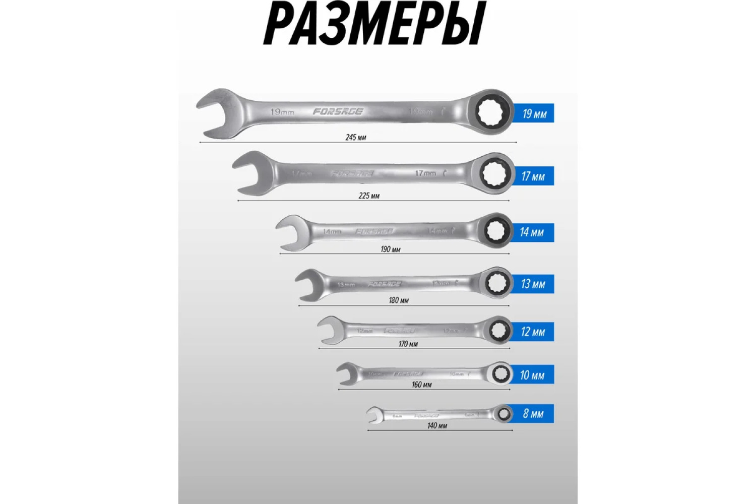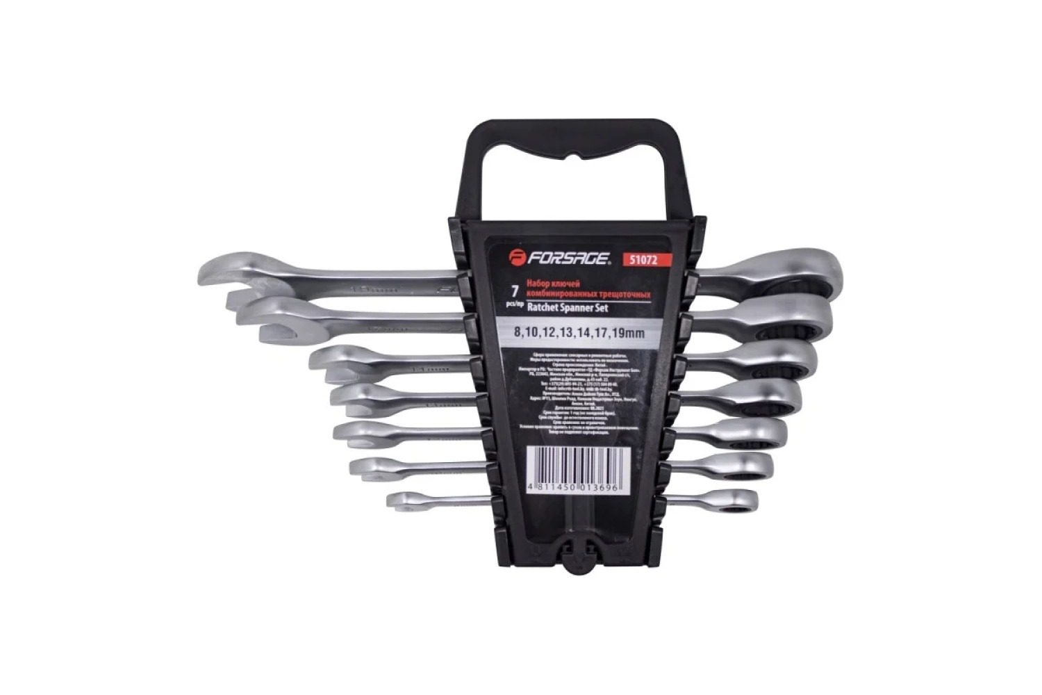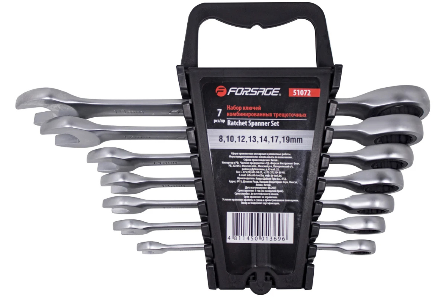 Kombinuotų raktų rinkinys iš prekės ženklo Forsage sudarytas iš 7 elementų ir skirtas veržlių bei varžtų montavimui su šešiakampiu profiliu. Šie raktys puikiai tinka automobilių, motociklų remontui, taip pat įrangos surinkimui ir įvairiems remonto darbams.