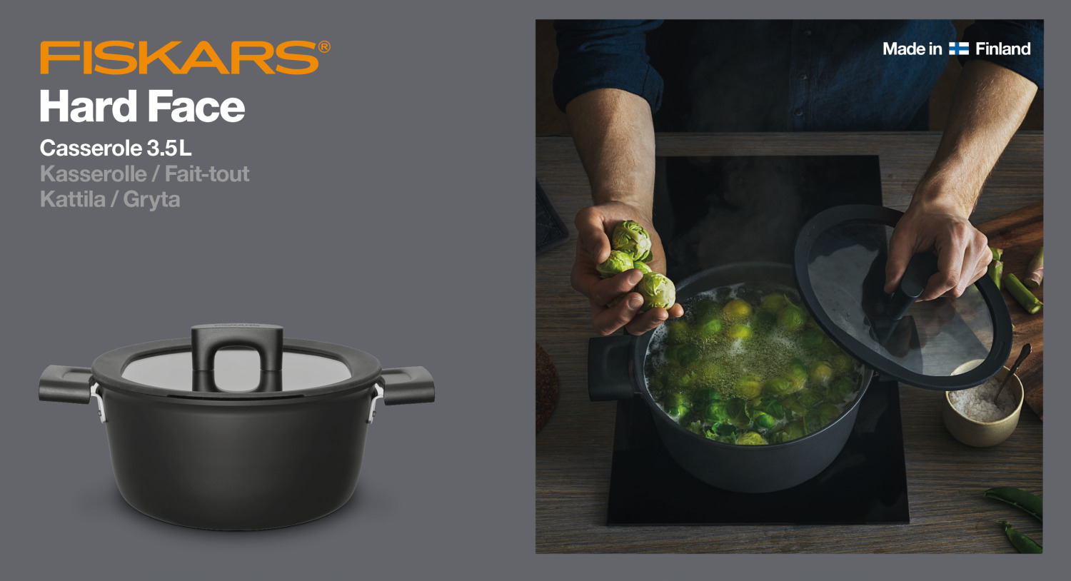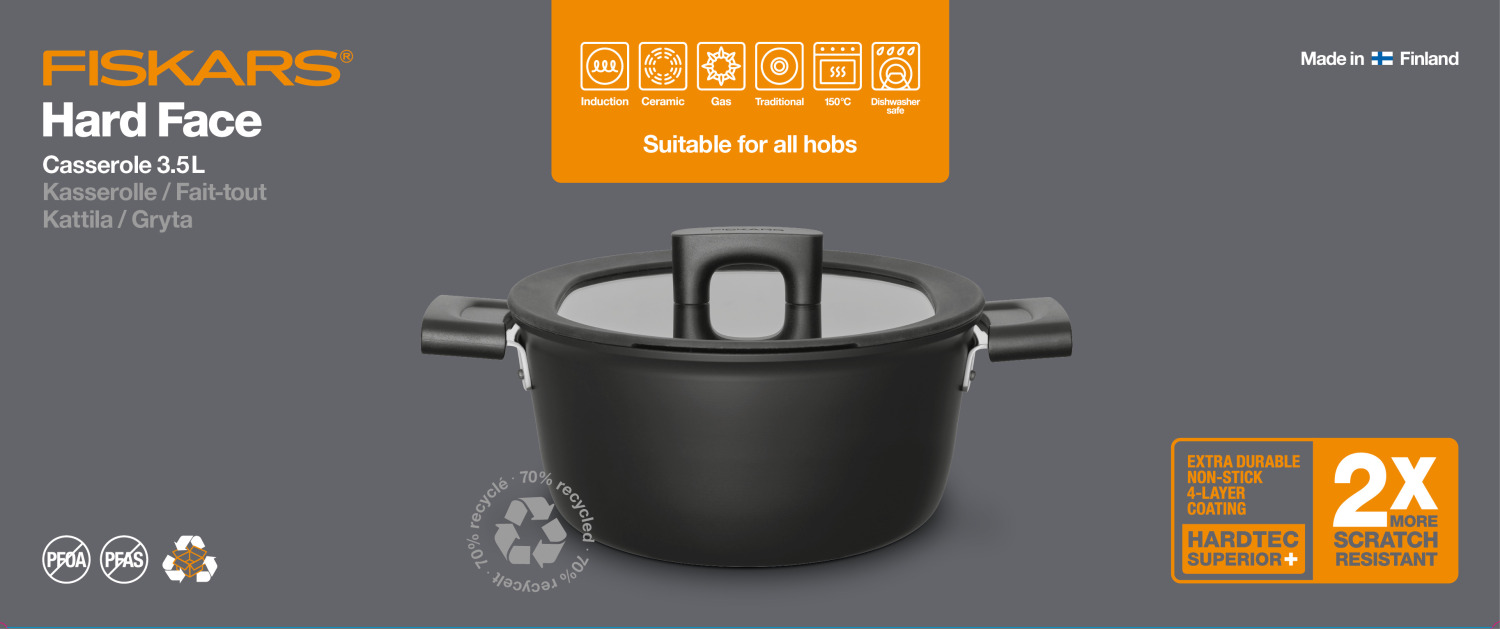 Katls Hard Face 22 cm, 3.5 l, FISKARS, 1052227, alumīnijs, nepiedegošais pārklājums, piemērots visām plītīm