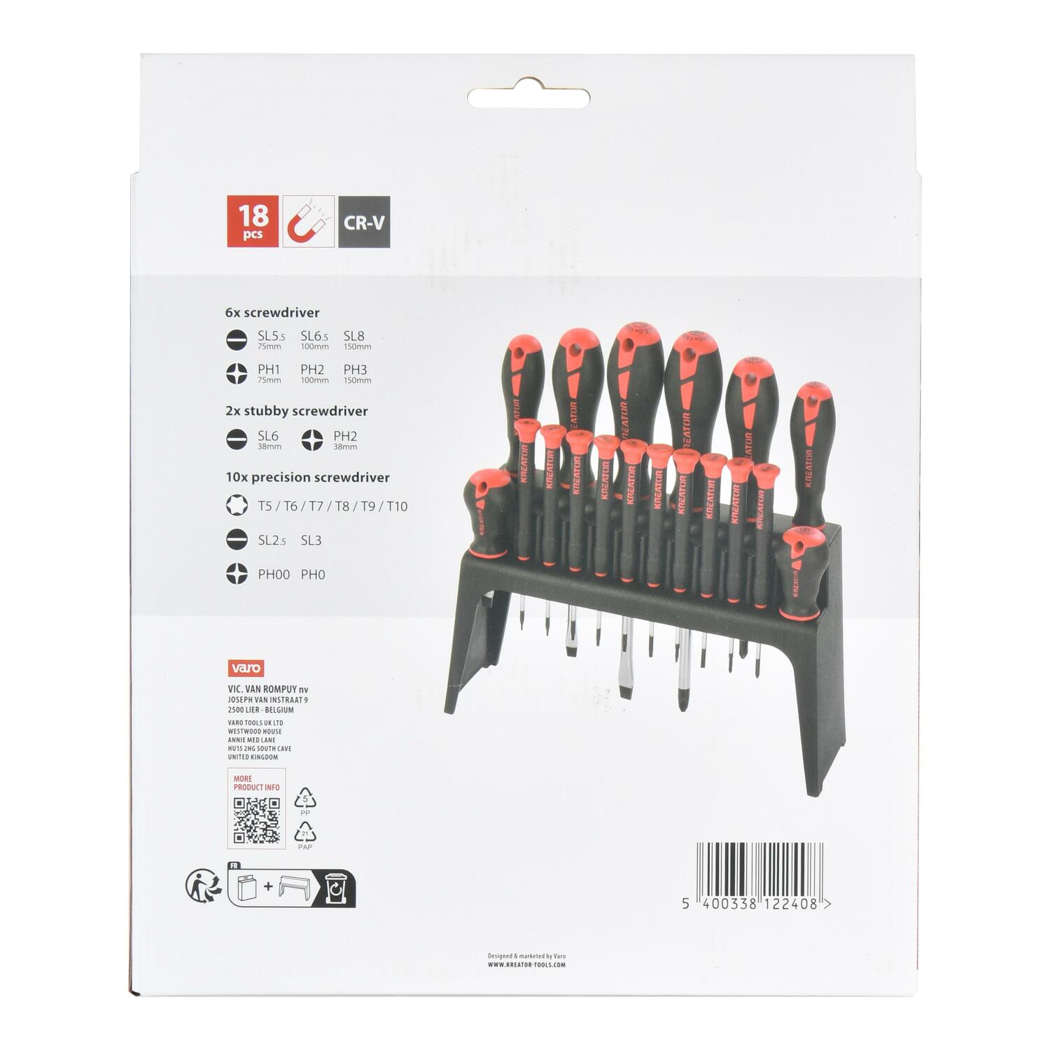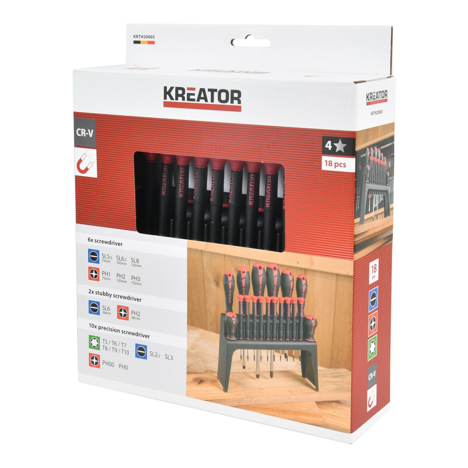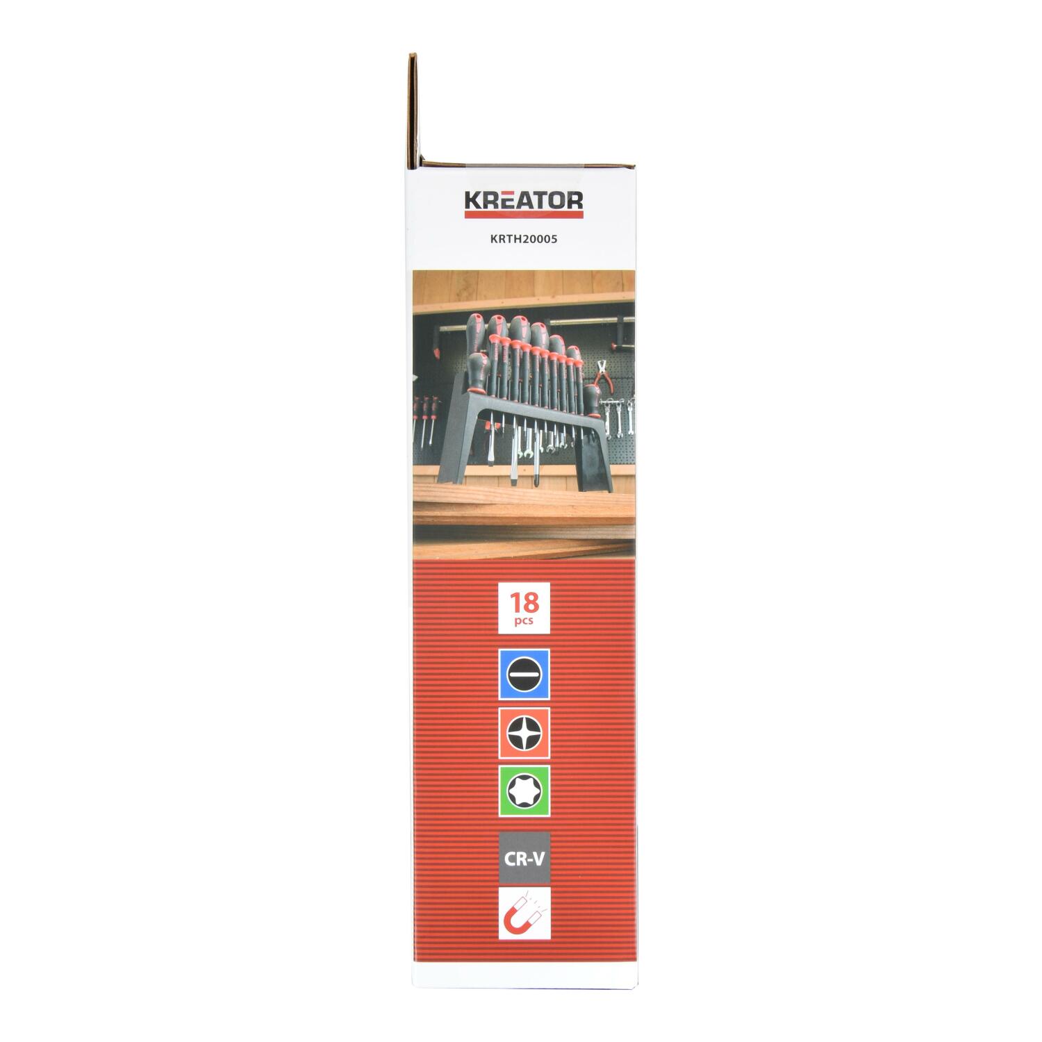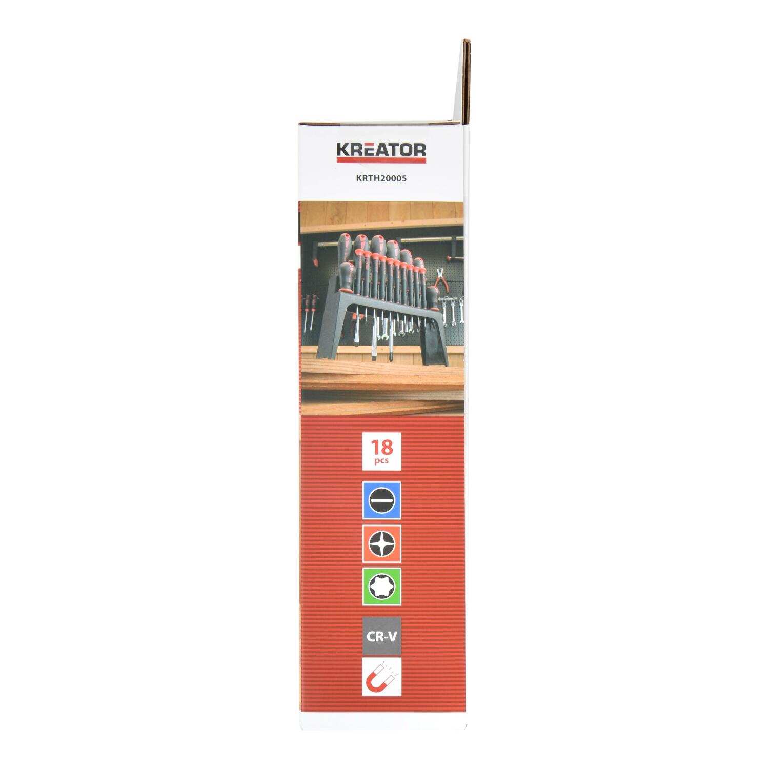 KREATOR KRTH20005 atsuktuvų rinkinys su 18 vnt. yra puikus įrankis bet kokiems projektams, susijusiems su varžtais. Hromo vanadžio atsuktuvai patogiai saugomi praktiškame dėkle, kurį taip pat galima kabinti ant sienos. Kiekvienas atsuktuvas turi magnetinį galiuką, todėl lengvai galima pritvirtinti varžtus. Rinkinį sudaro plokšti, PH ir TX atsuktuvai. Minkštas, neslystantis rankenos dizainas užtikrina tvirtą sukibimą.