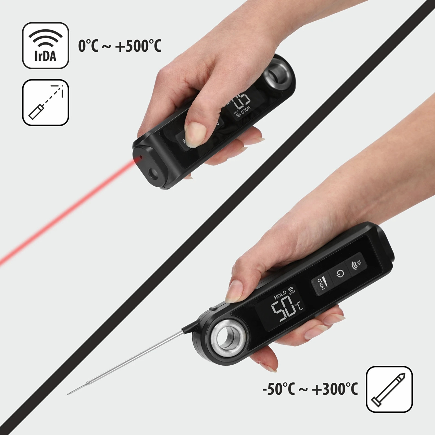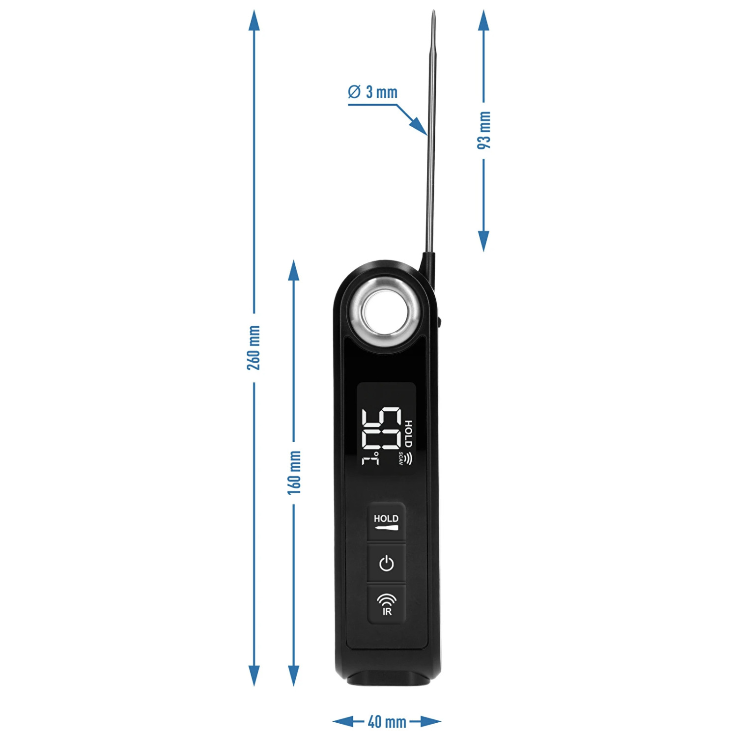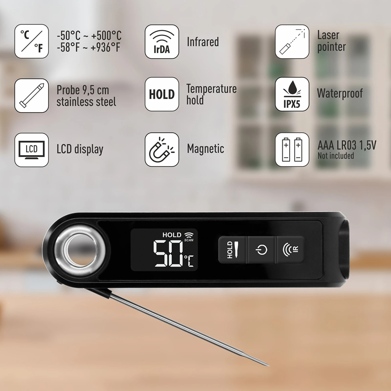 Atraskite įrankį, kuris padarys jūsų gaminimą patogesnį ir tikslų – kompaktišką virtuvinį termometrą su sulankstomu zondą ir infraraudonųjų spindulių matavimo galimybe.