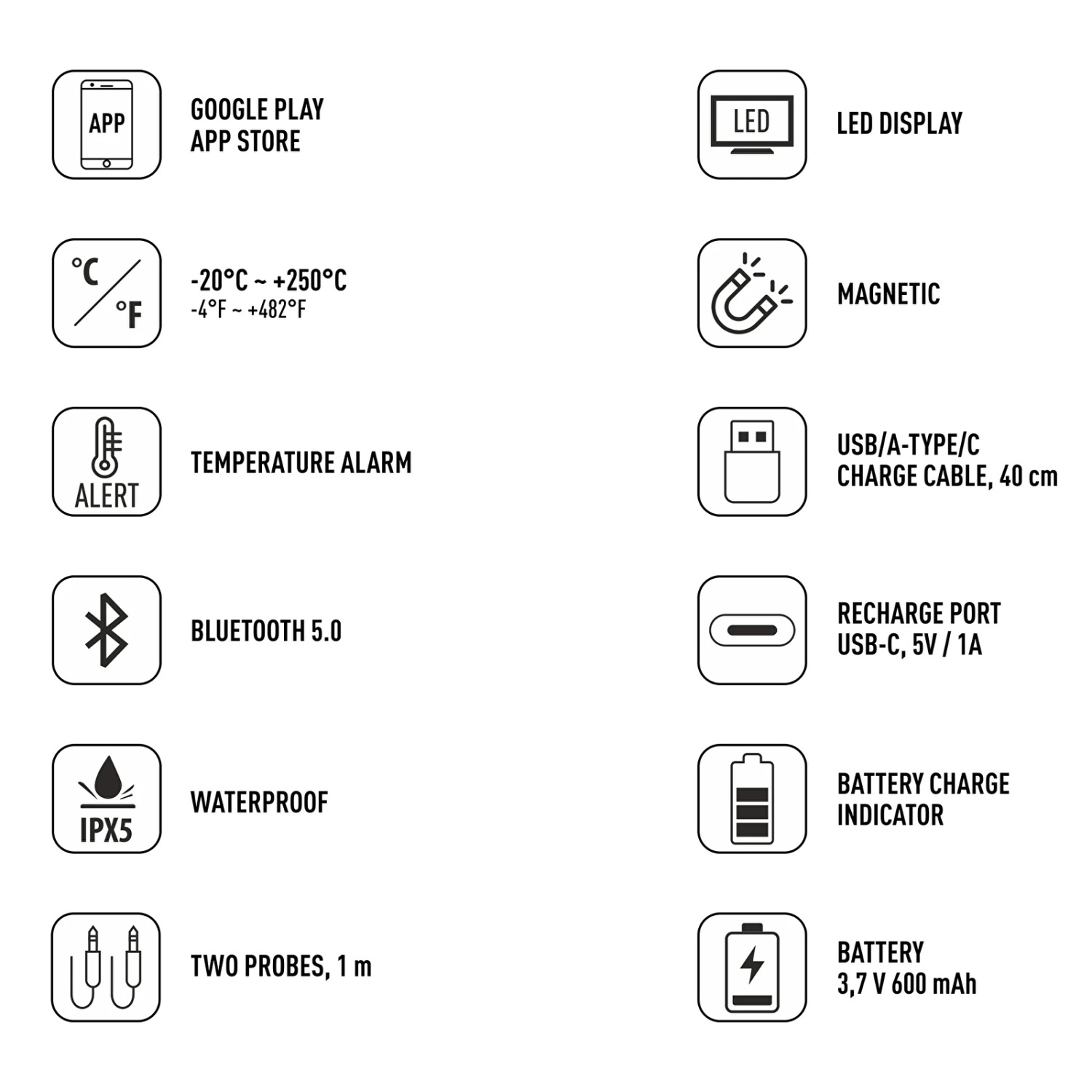 - Temperatūros matavimo diapazonas: -20~+250°C (-4~482°F)