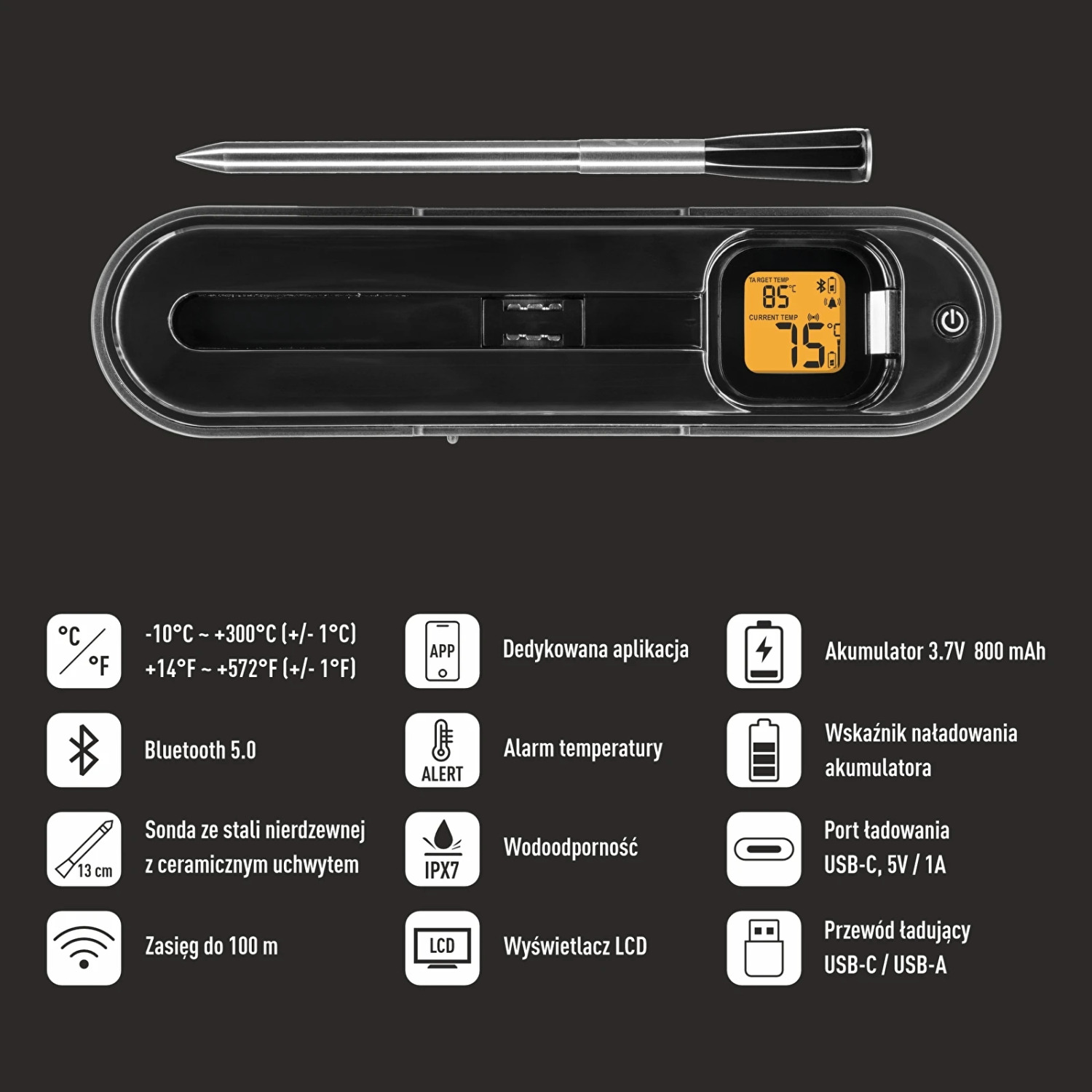 Šis termometras ne tik atitinka lūkesčius - jis nustato naujus standartus naudojimo patogumui. Puikiai atliks savo užduotis, kol jūs dirbsite namuose ar sode, kartais tikrindami su išmaniuoju telefonu svarbius parametrus, perduodamus precizine sonda, Bluetooth ir programėle.