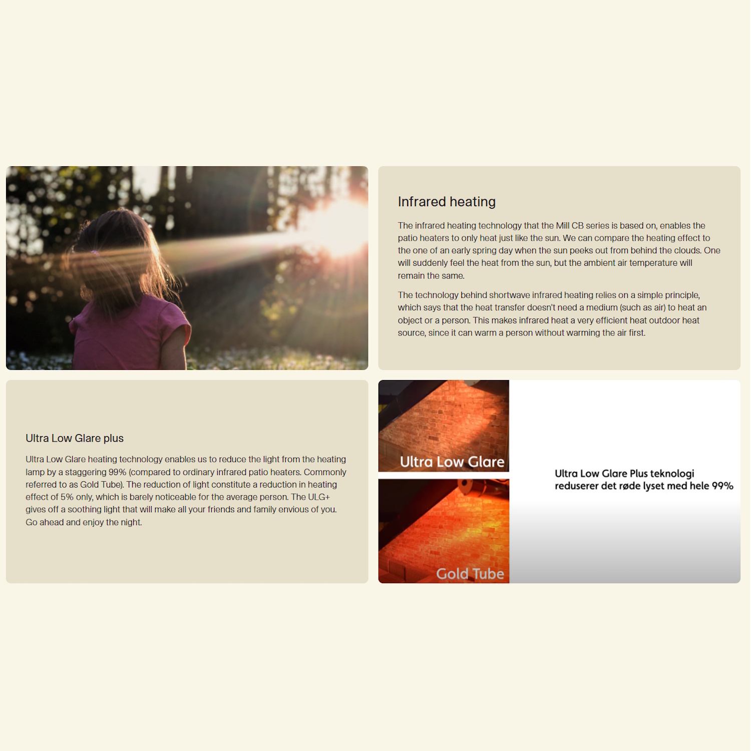 Mill OH2000ULGPSLIM – galingas 2000 W lauko šildytuvas su sieniniu tvirtinimu ir nuotolinio valdymo pultu, skirtas terasoms, balkonams, restoranų lauko zonoms ir sodo poilsio erdvėms. Dėl „Ultra Low Glare Plus“ technologijos jis skleidžia malonią infraraudonųjų spindulių šilumą be akinamos šviesos, sukuriant jaukią atmosferą vakarais ir vėsesniu oru. Korpusas pagamintas iš tvirto aliuminio, o IP65 apsaugos klasė užtikrina saugų veikimą lauke net ir lyjant ar esant dulkėms.