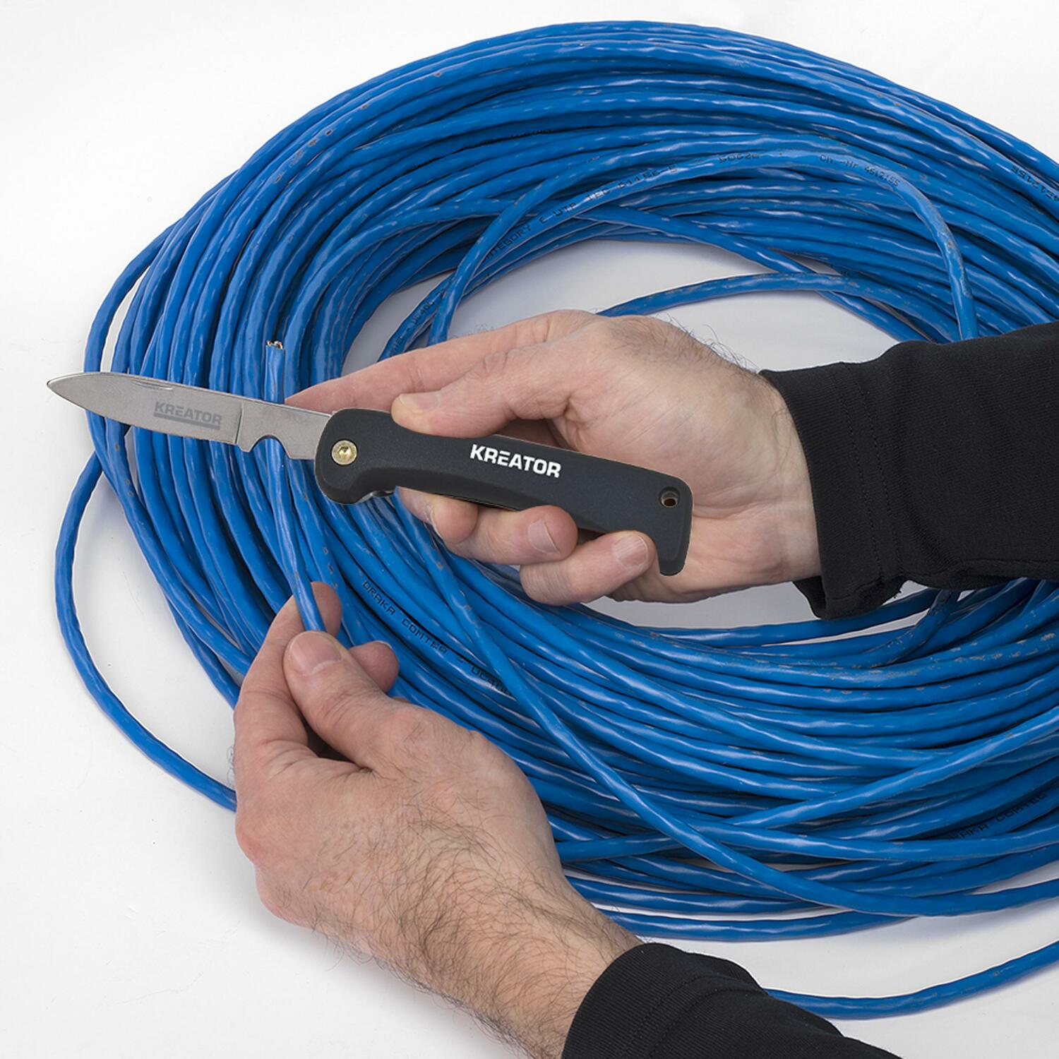 KREATOR elektriko peilis (modelis KRTH00801) yra ypač naudingas įrankis dirbant su elektros kabeliais ir laidais. Dėl itin aštraus ašmenų, lengvai galėsite juos supjaustyti iki reikiamo dydžio. Patogu naudoti mažą išpjovą, skirtą greitam kabelių nuėmimui. Patys peiliai yra sulankstomi, todėl juos saugiai ir kompaktiškai saugoti.