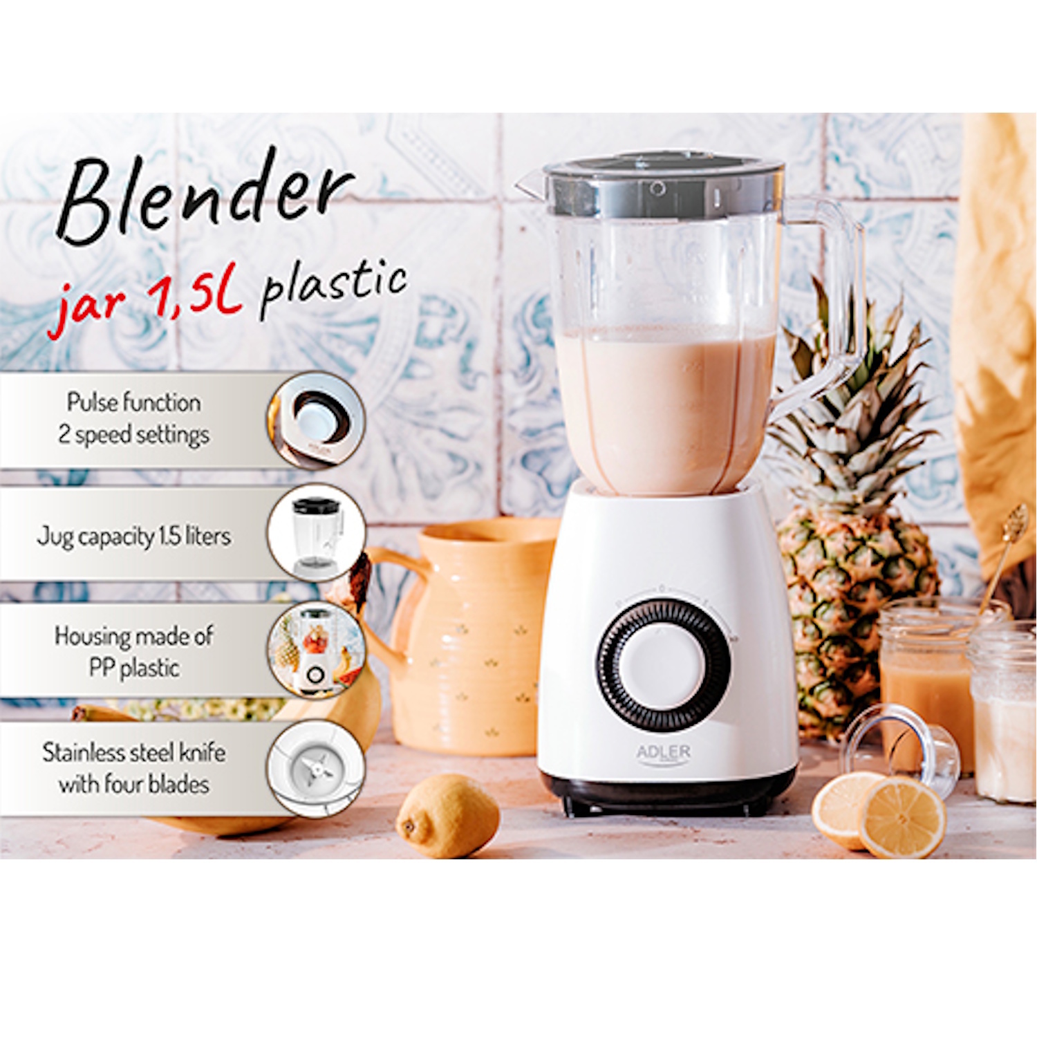 Stalinis blenderis su 1000W maišymo galia ir didelės talpos 1.5L plastikiniu indu baltas AD4085 Adler