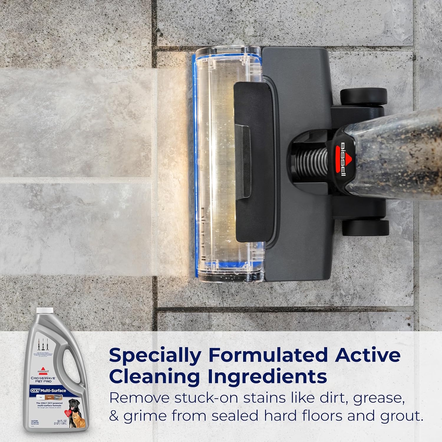 Įprasti grindų plovikliai dažnai nėra pritaikyti naudoti kartu su plovimo-siurbimo sistemomis ir gali pernelyg putoti ar palikti apnašas. CrossWave Pet Pro Oxy formulė pritaikyta BISSELL įrangai, kad aktyvus deguonis efektyviai padėtų kovoti su dėmėmis, o žemas putojimas saugotų įrenginio mechaniką. Tai reiškia gilesnį, gaivesnį ir patogesnį valymą, ypač jei namuose yra šunų, kačių ar vaikų.