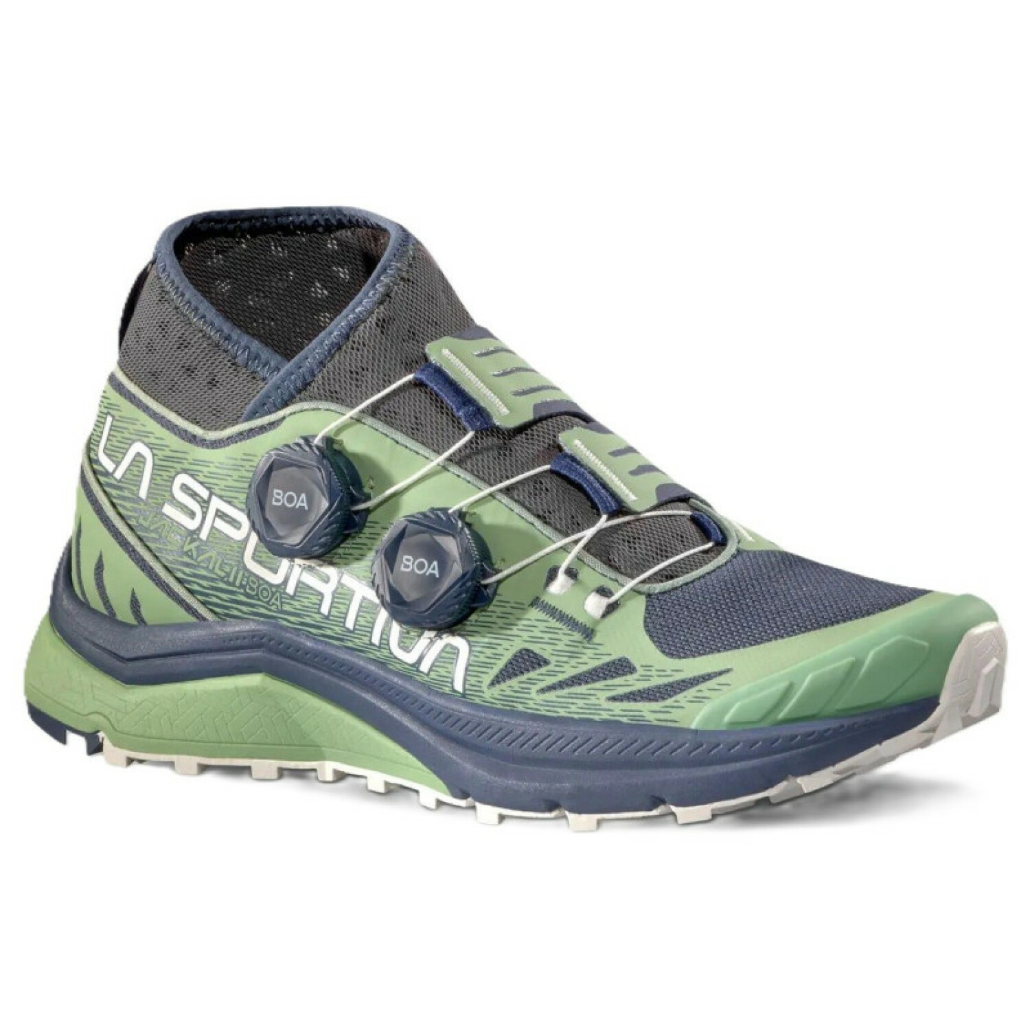 LA SPORTIVA JACKAL II Boa moteriški batai yra aukšto našumo kalnų bėgimo batai, skirti ilgiems atstumams. Šie batai pasižymi mokslininkų išbandyta ir įrodyta PerformFit™ Wrap konstrukcija, kurią lengva reguliuoti naudojant BOA® Fit sistemą, užtikrinančią greitą, patogų reguliavimą ir maksimalų tikslumą prigludus prie pėdos.