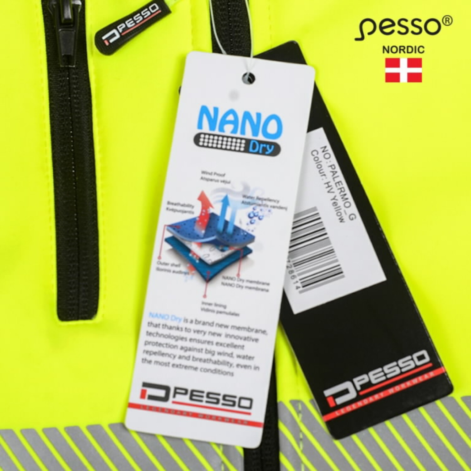 Aukštos matomumo softshell striukė Palermo, 4XL, Pesso, sukurta siekiant apsaugoti jus nuo vėjo ir vandens, yra patogi ir funkcionali apranga įvairioms lauko veikloms.