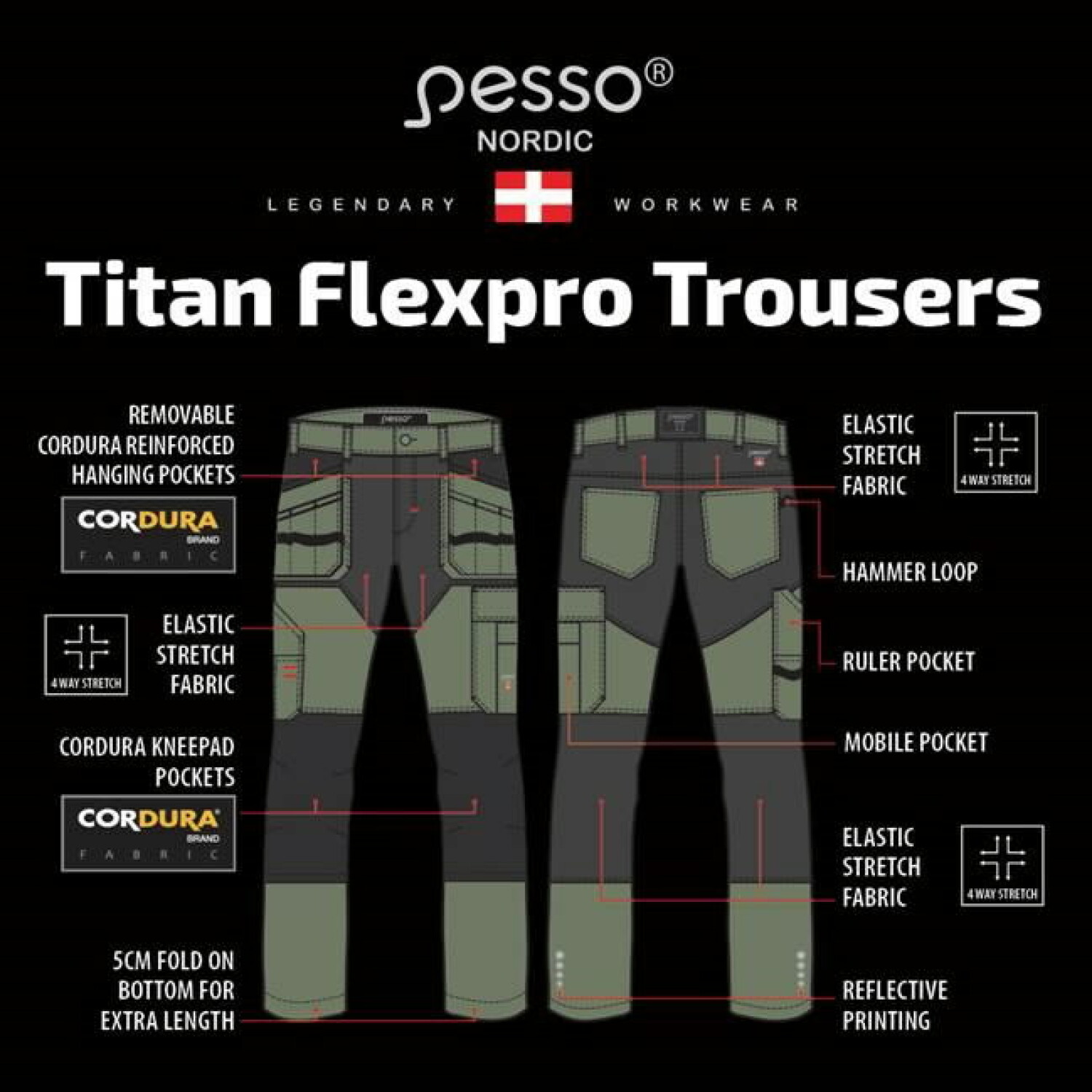 PESSO Titan Flexpro kelnės, C46 modelis, yra idealus pasirinkimas darbui, nes pasižymi aukštos kokybės medžiagomis ir funkcionalumu. Šios kelnės yra pagamintos iš itin tvirto audinio su legendinių Cordura® medžiagų detalėmis, užtikrinančiomis ilgalaikį patvarumą ir 4-jų krypčių elastingumo įsiuvais, kurie leidžia laisvai judėti.