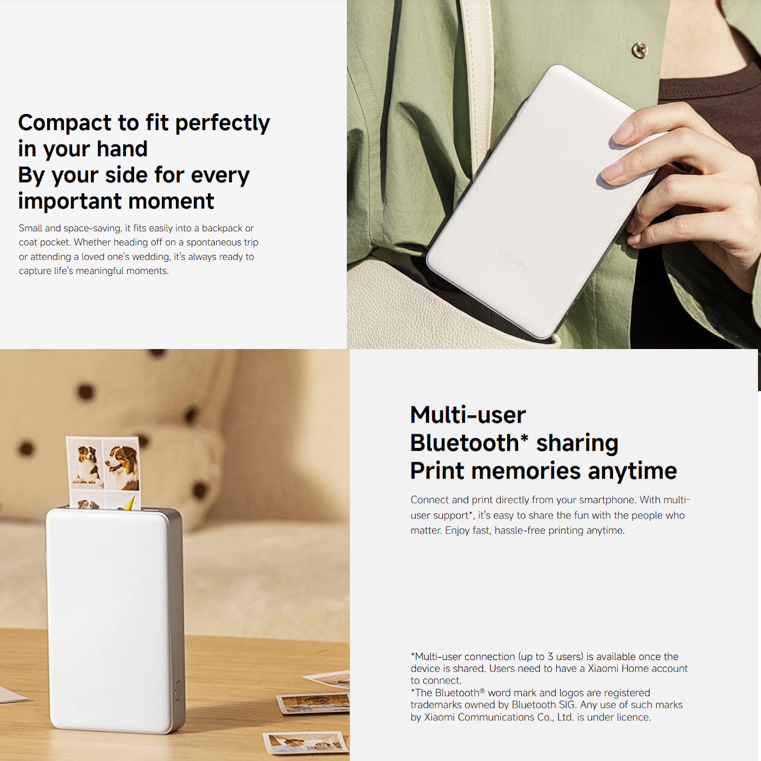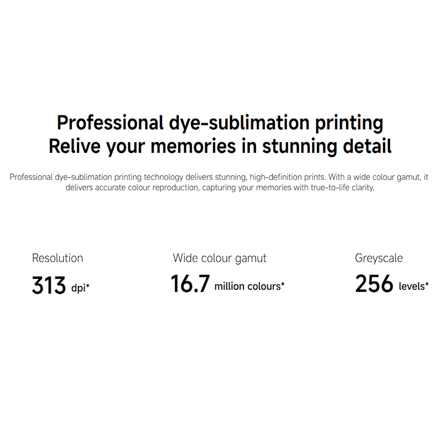 Xiaomi Portable Photo Printer Pro – tai kompaktiškas ir modernus nešiojamas fotoprinteris su Bluetooth ryšiu ir profesionalia dažų sublimacijos (dye-sublimation) spausdinimo technologija, leidžiantis greitai ir kokybiškai spausdinti nuotraukas bet kada ir bet kur. 313 × 313 dpi raiška ir automatinė laminacija užtikrina ryškius, ilgaamžius ir detalius atspaudus tiesiai iš išmaniojo telefono ar planšetės.