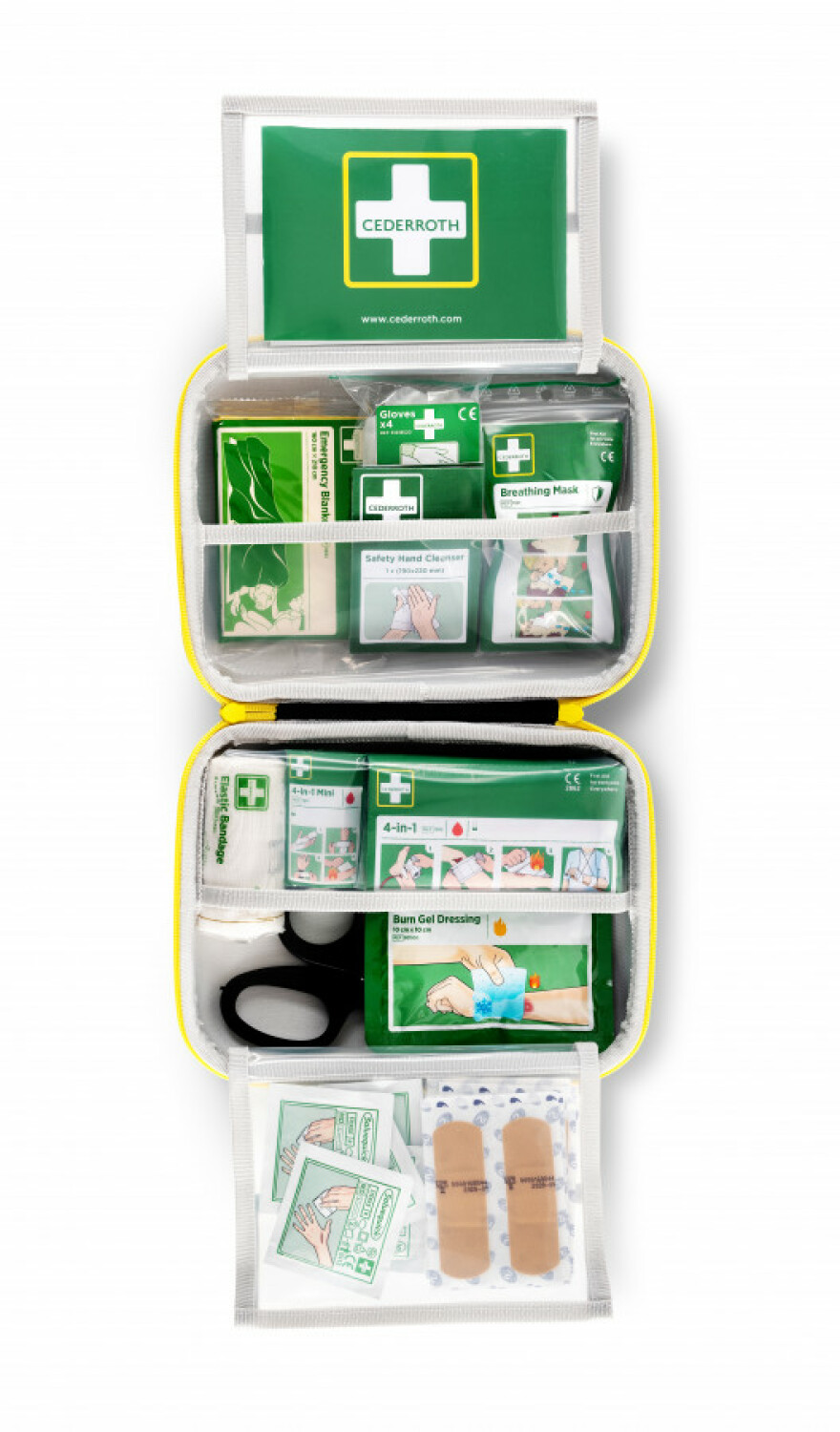 Cederroth M dydžio pirmosios pagalbos rinkinys yra tvirtame krepšyje, kuris apsaugo turinį nuo dulkių, purvo ir drėgmės. Visi įrankiai laikomi higieniškomis sąlygomis, todėl jie visada pasiruošę naudojimui. Produktai supakuoti skaidriame plastikiniame įpakavime, leidžiančiame matyti turinį ir greitai rasti reikiamą priemonę.
