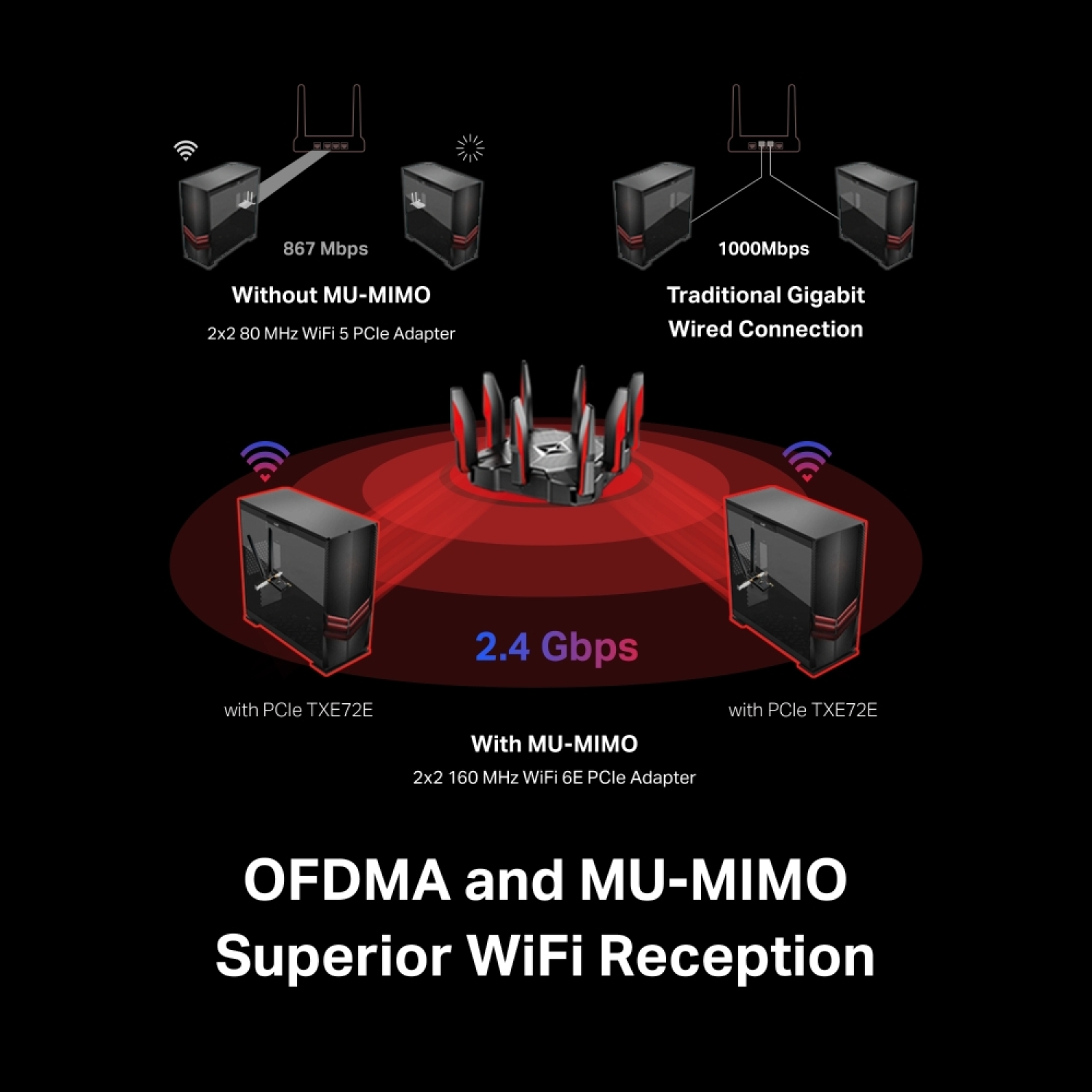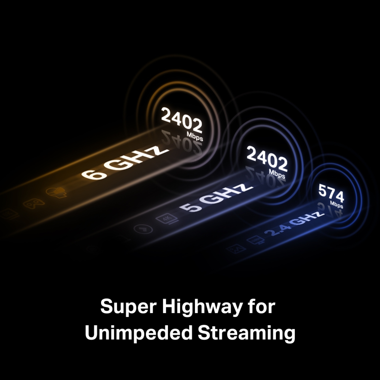 • Neprilygstama tri-bendžio greitis — pagerinkite bendrą greitį iki 2402 Mbps (6 GHz) + 2402 Mbps (5 GHz) + 574 Mbps (2.4 GHz).