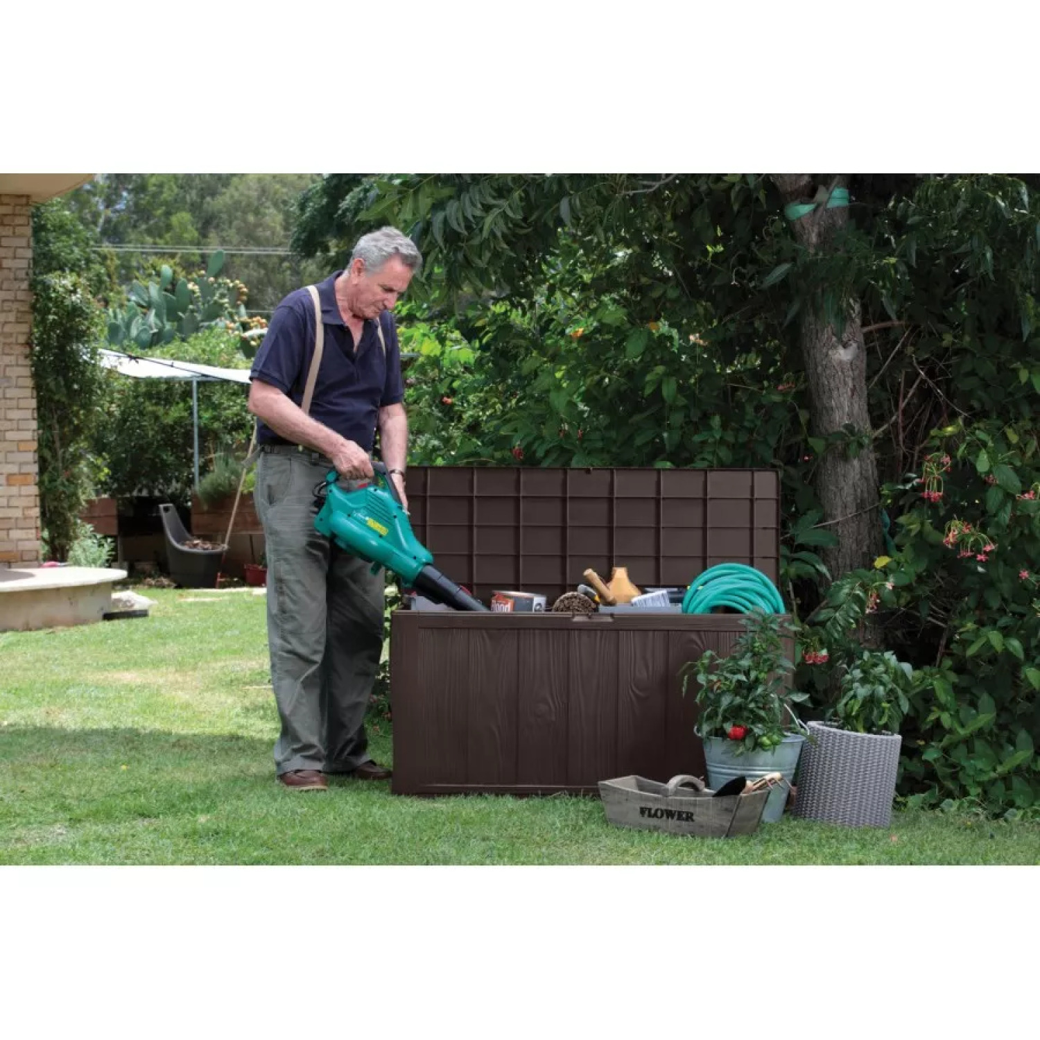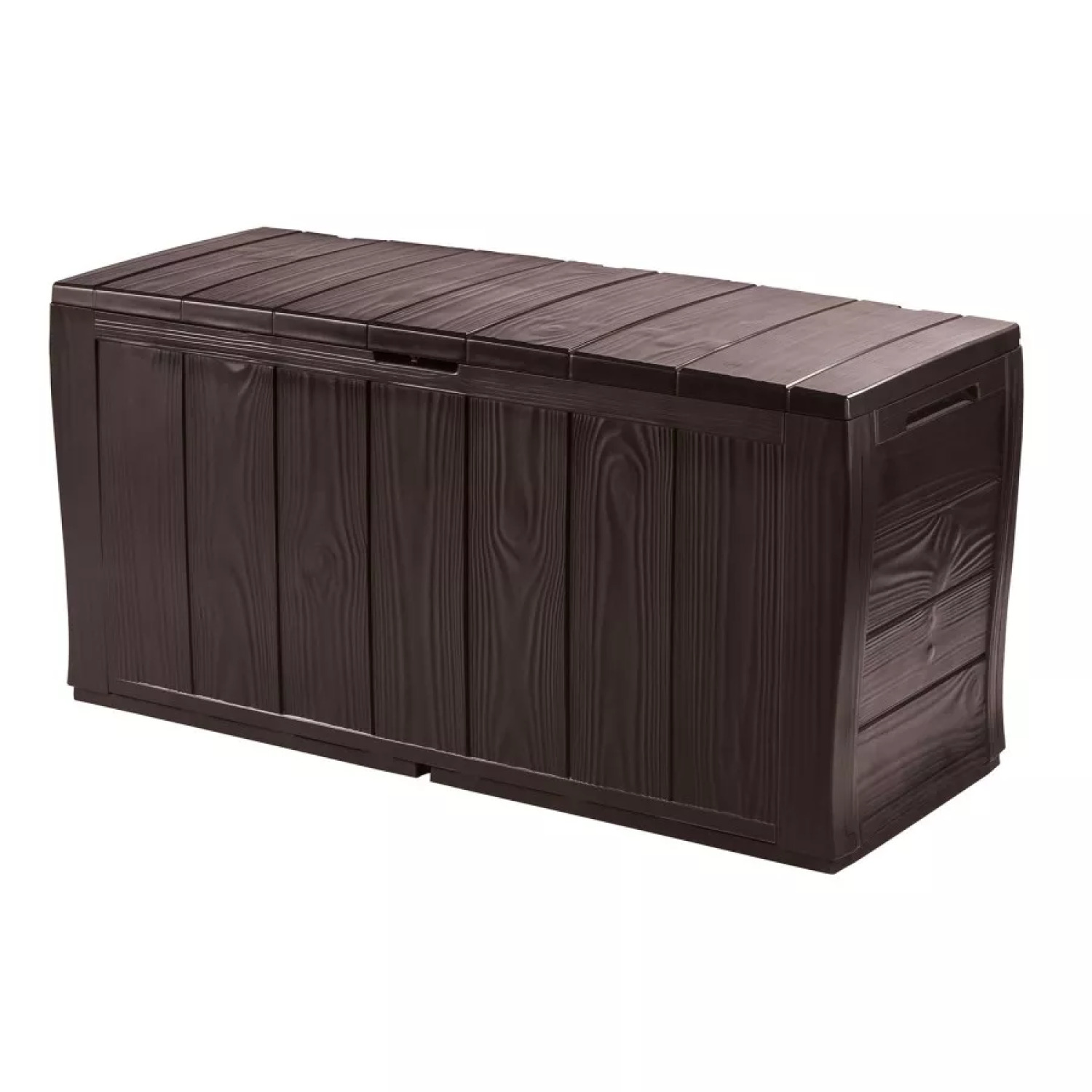 Ši graži ir praktiška dėžė pagaminta iš tvirtų modernių kompozitinių medžiagų, atsparių saulės ir oro poveikiui, imituojančių medieną. Ji puikiai tinka laikyti sodo pagalves, žaislus ir grilio priedus, gerai ventiliuojama ir išlaiko viduje esančius daiktus sausus. Dėžė gali talpinti du žmones iki 220 kg svorio, todėl ji yra puikus lauko baldų pasirinkimas atsipalaidavimo metu. Integruoti rankenėlės leidžia lengvai ją perkelti.