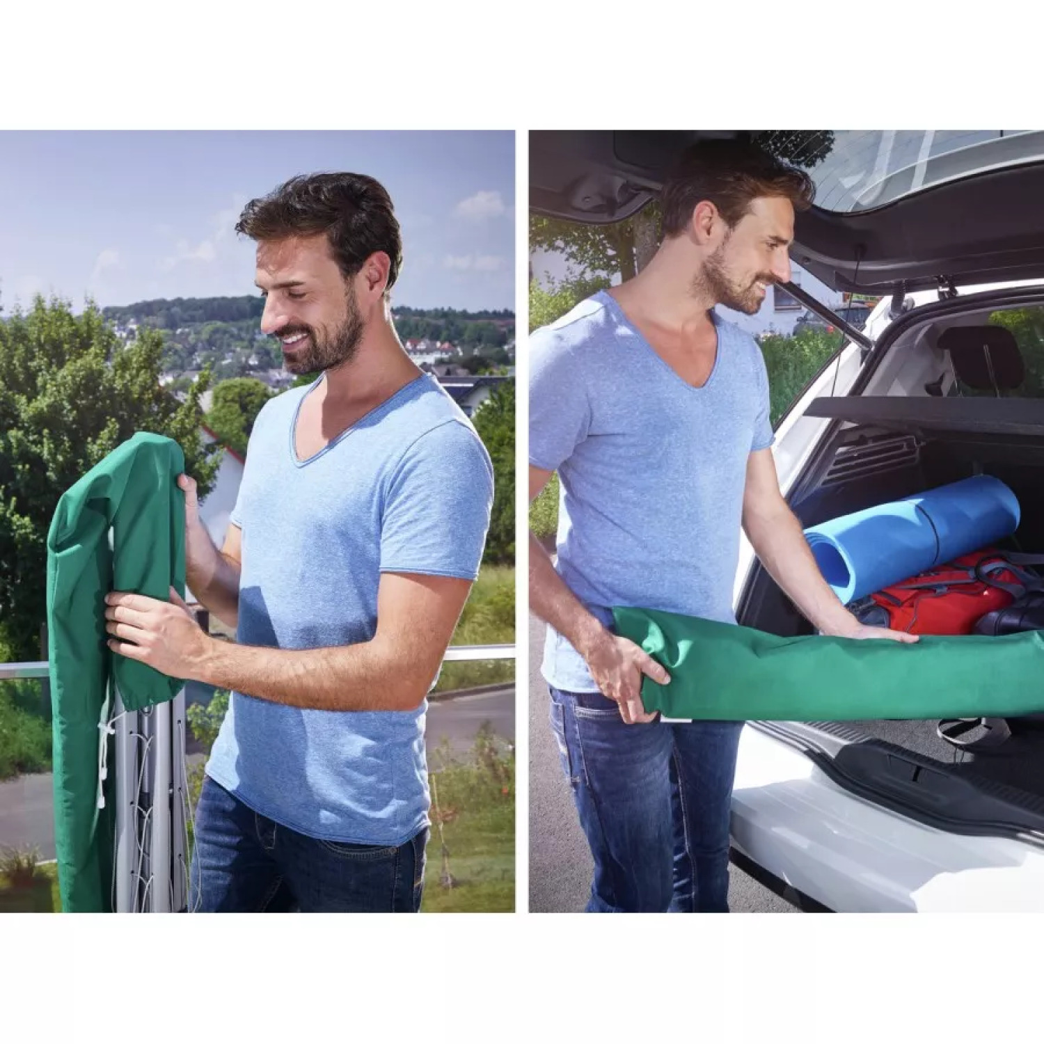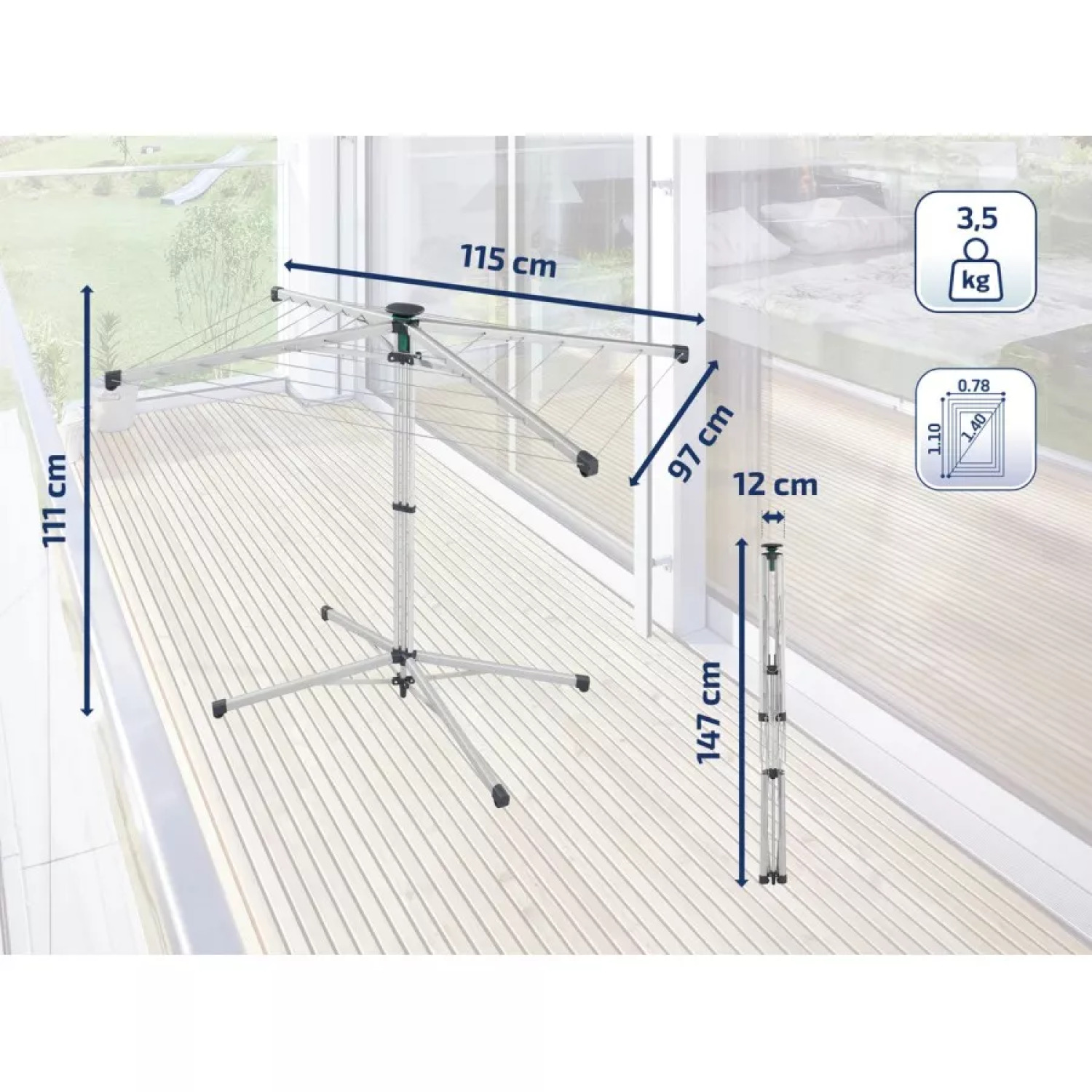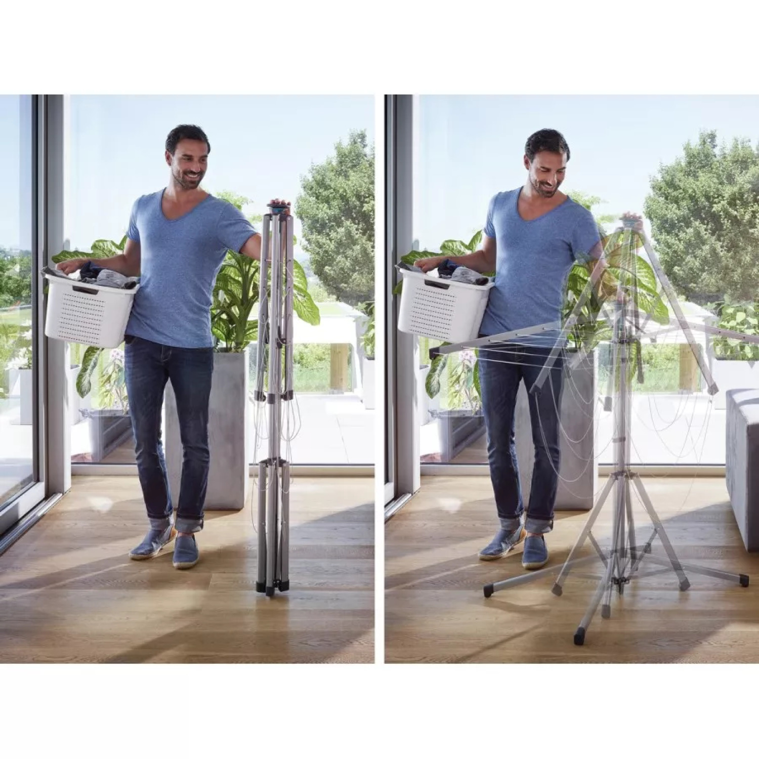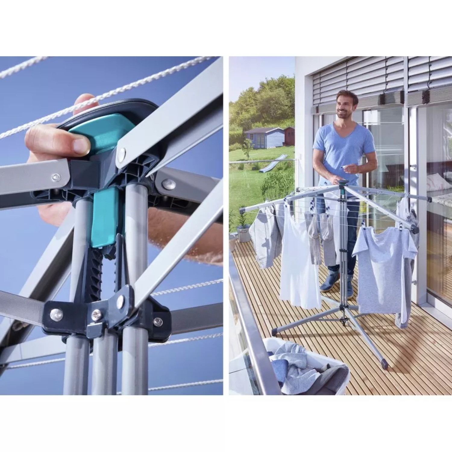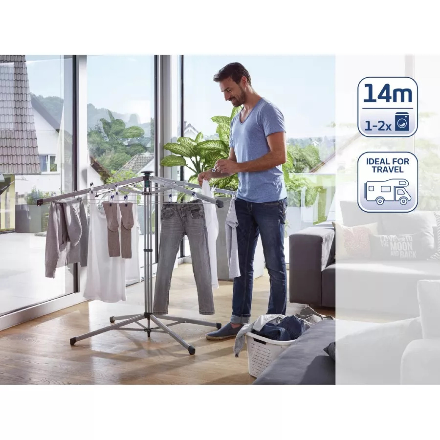 Skalbinių džiovyklė LinoPop-Up 140 yra idealus sprendimas namams ir kelionėms. Ji lengvai naudojama, ją galima atidaryti viena ranka, o laikyti kompaktiškai. Tiesiog paspauskite centrinę rankenėlę ir keturios strėlės atsidaro bei užsifiksuoja - jūsų džiovyklė paruošta naudojimui. Idealiai tinka namuose, siauriems balkonams, mažoms terasoms ar vonios kambariams, taip pat kelionėse, stovyklavietėse ar kemperiuose. Lengva LinoPop-Up 140 svoris yra vos 3,6 kg, todėl ją patogu transportuoti. 14 metrų virvė suteikia pakankamai vietos skalbiniams džiovinti net mažesnėje nei vieno kvadratinio metro erdvėje.