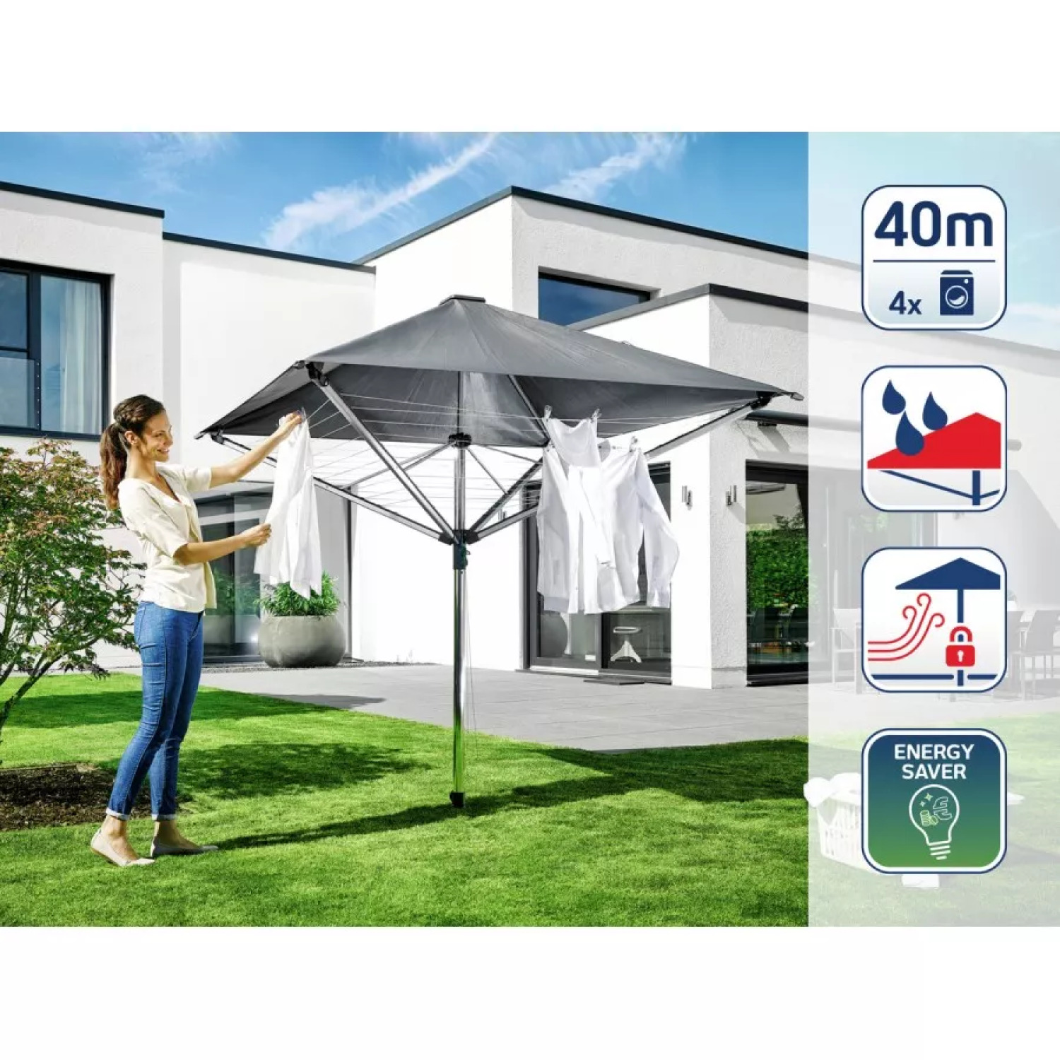 Leifheit Lino Protect 400 rotacinė džiovykla apsaugos jūsų skalbinius lyjant lietui, nuo kenksmingos UV spinduliuotės, kuri gali išblukti audinius, ir nuo įvairių nešvarumų. Taigi, jei planuojate nebūti namuose, galite drąsiai džiovinti skalbinius lauke, nesijaudindami, kad jie gali sušlapti.