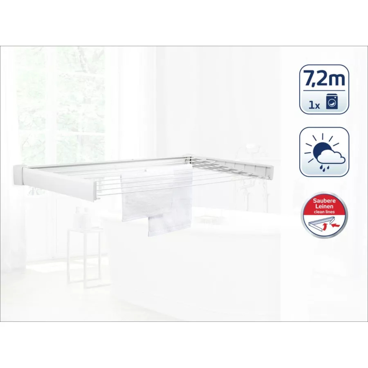 Sieninis džiovintuvas LEIFHEIT Telegant 72 Protect yra puikus sprendimas džiovinti skalbinius tiek viduje, tiek lauke. Su kompaktišku dizainu, jis užima mažai vietos ir yra apsaugotas nuo vandens poveikio. Šis džiovintuvas turi aštuonis džiovinimui skirtus strypus, kurių bendras ilgis yra 7,20 m, užtikrinantis pakankamai vietos jūsų drabužiams.