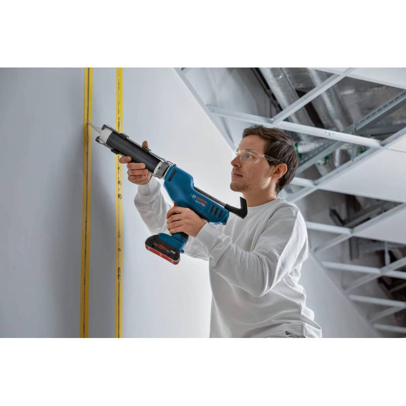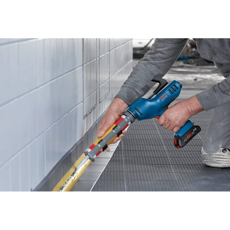 Kompaktiškas GCG 18V-310 sandarinimo pistoletas pasižymi belaidžiu patogumu ir tinka kasetėms iki 310 ml. Kontroliuoti medžiagos srautą lengva, nes tai užtikrina devyni pistoleto greičių nustatymai ir reguliuojamo greičio paleidiklis. Juo galima greitai dirbti net ir naudojant didelio klampumo medžiagas, kurių stūmimo jėga 3,5 kN, o maksimalus tiekimo greitis 7 mm per sekundę. Įrankio automatinio reverso funkcija sumažina spaudimą į stūmoklio strypą, kai atleidžiamas jungiklis, taip išvengiama lašėjimo ir medžiagos pertekliaus.