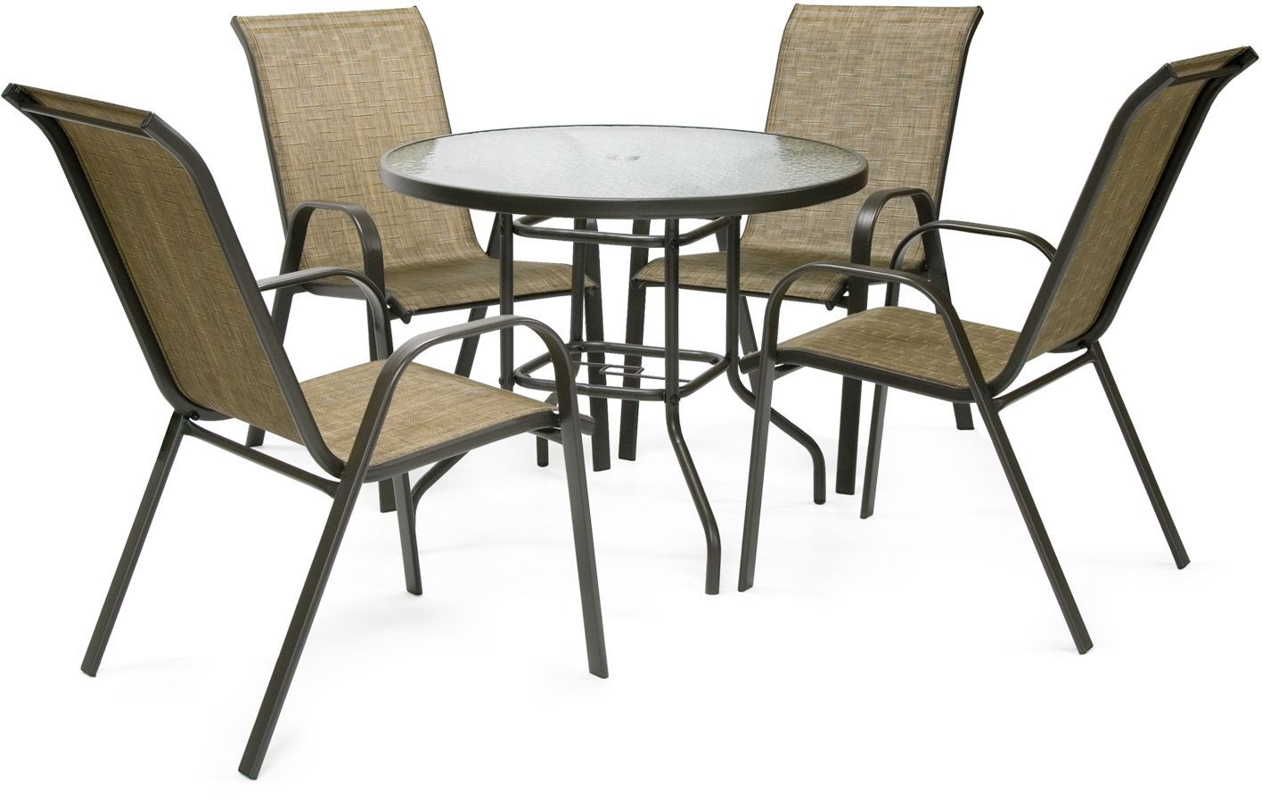 DUBLIN sodo baldų komplektą sudaro stalas ir 4 kėdės, aukso rudos spalvos. Stalviršis: 5 mm skaidrus gofruotas stiklas. Stalo viduryje yra 4 cm skersmens skėtis nuo saulės. Stalo rėmas ir kojos pagamintos iš plieno ir padengtos tamsiai ruda milteliniais dažais. Kėdės tekstilinė sėdynė gerai vėdinama, greitai džiūsta ir yra lengvai valoma. Kėdės rėmas ir kojos pagamintos iš plieno ir padengtos tamsiai ruda milteliniais dažais. Kėdės yra sudedamos viena ant kitos, todėl jas lengva sandėliuoti ir sutaupyti vietos. Sėdynės plotis 45 cm, gylis 41 cm, aukštis 44 cm. Atlošo aukštis 57 cm. Porankio aukštis nuo žemės yra 61 cm. Svorio apribojimas 100 kg.