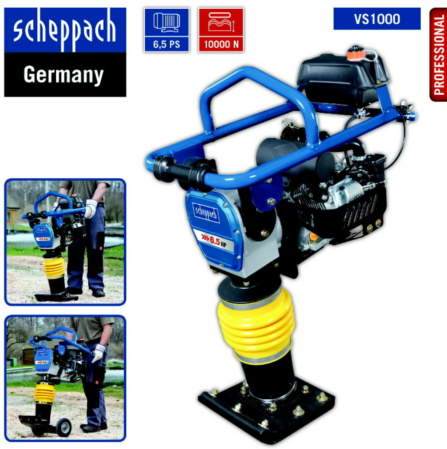Vibroplokštė VS1000, 10KN, 78kg, SCHEPPACH, 3908301915, 345 x 285 mm, 10000 N, 40 - 60 mm, 450 - 650 vpm, 6,5 AG