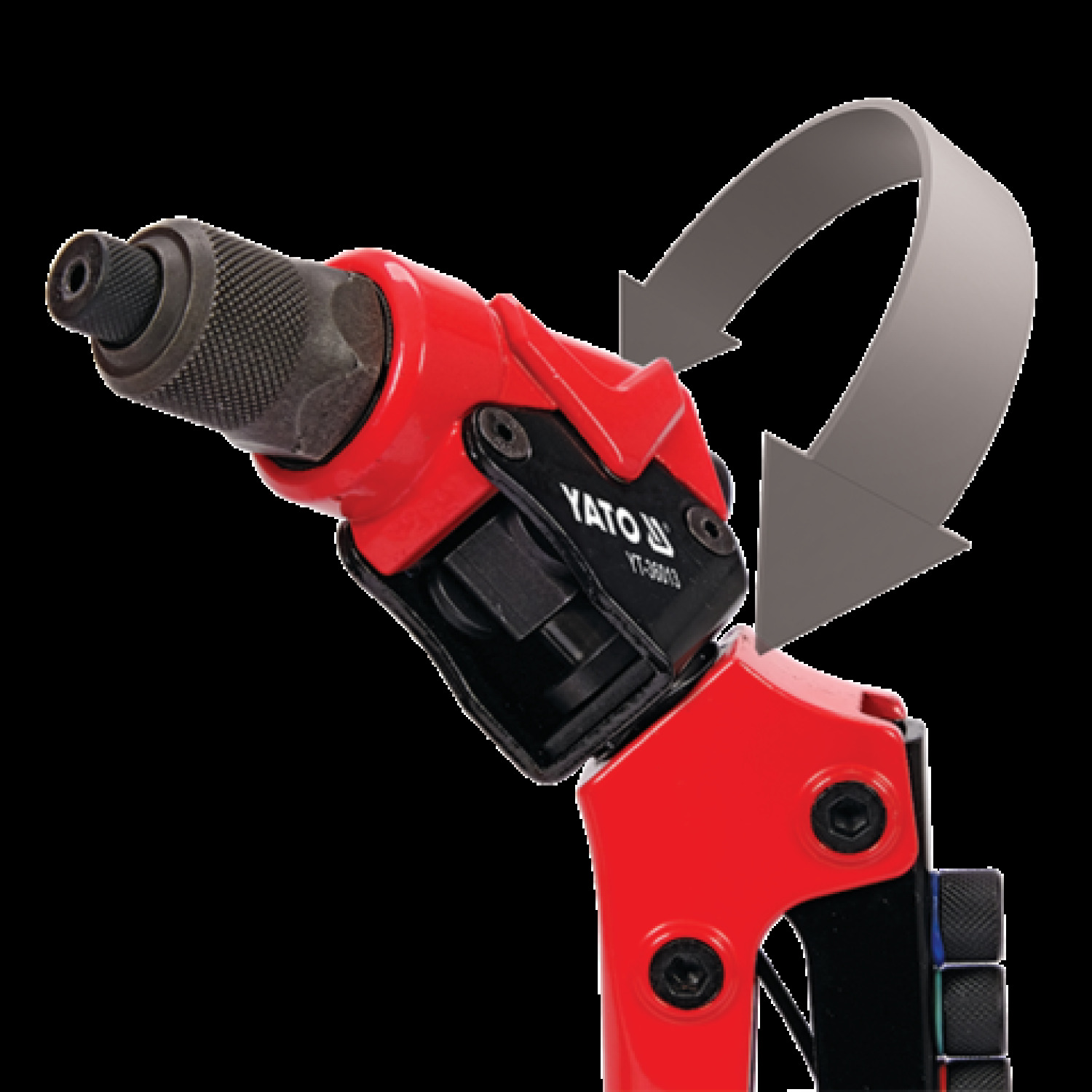 Kniediklis YATO YT-36013 su 360° sukamuoju galvute leidžia dirbti patogioje padėtyje, tinka net sunkiai prieinamose vietose. Jis leidžia atlikti kniedžių ir kniedžių-veržlių jungtis, taip pat pjaustyti medžiagas ir plėsti skylutes.