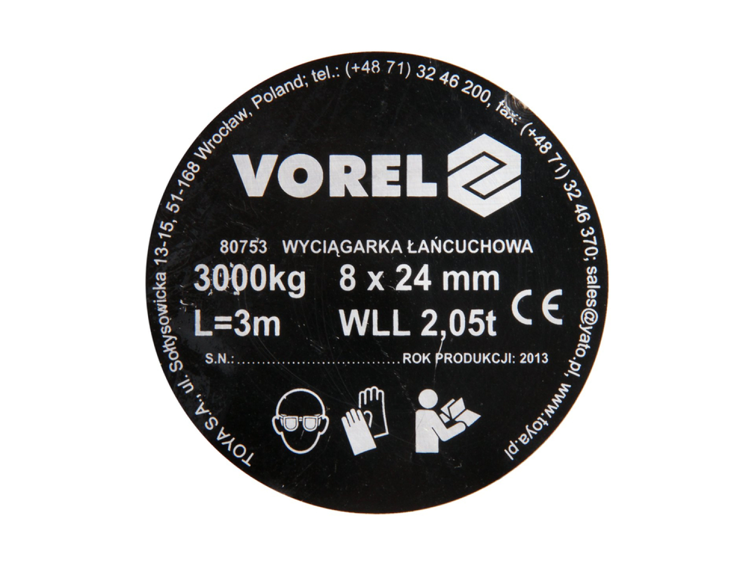 VOREL prekinio ženklo grandininė gervė, modelio kodas 80753, skirta įvairioms kėlimo užduotims. Ji turi mechaninį pavarą ir efektyvią planetarinę pavarą, leidžiančią pakelti maksimalų svorį nuo 500 iki 3000 kg.