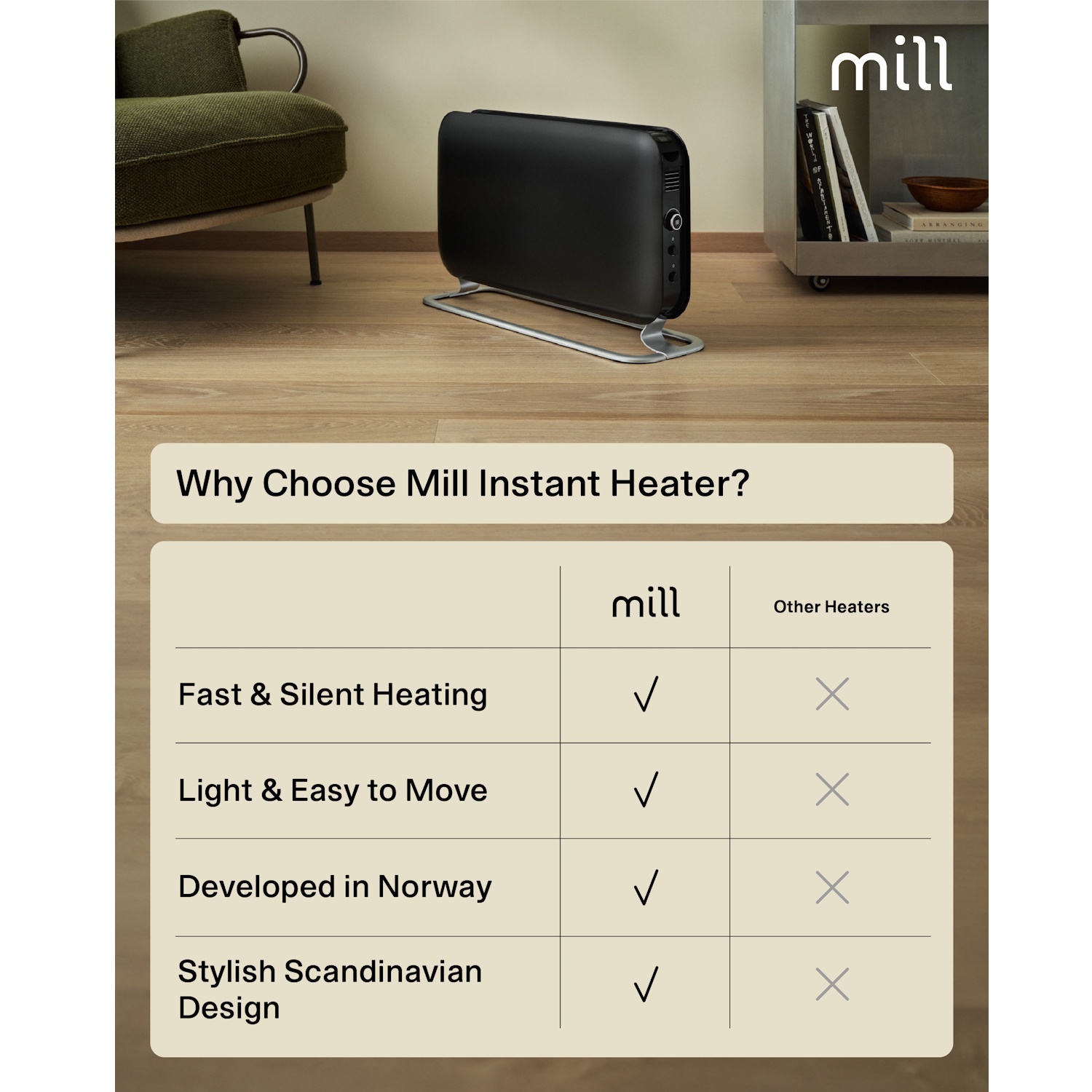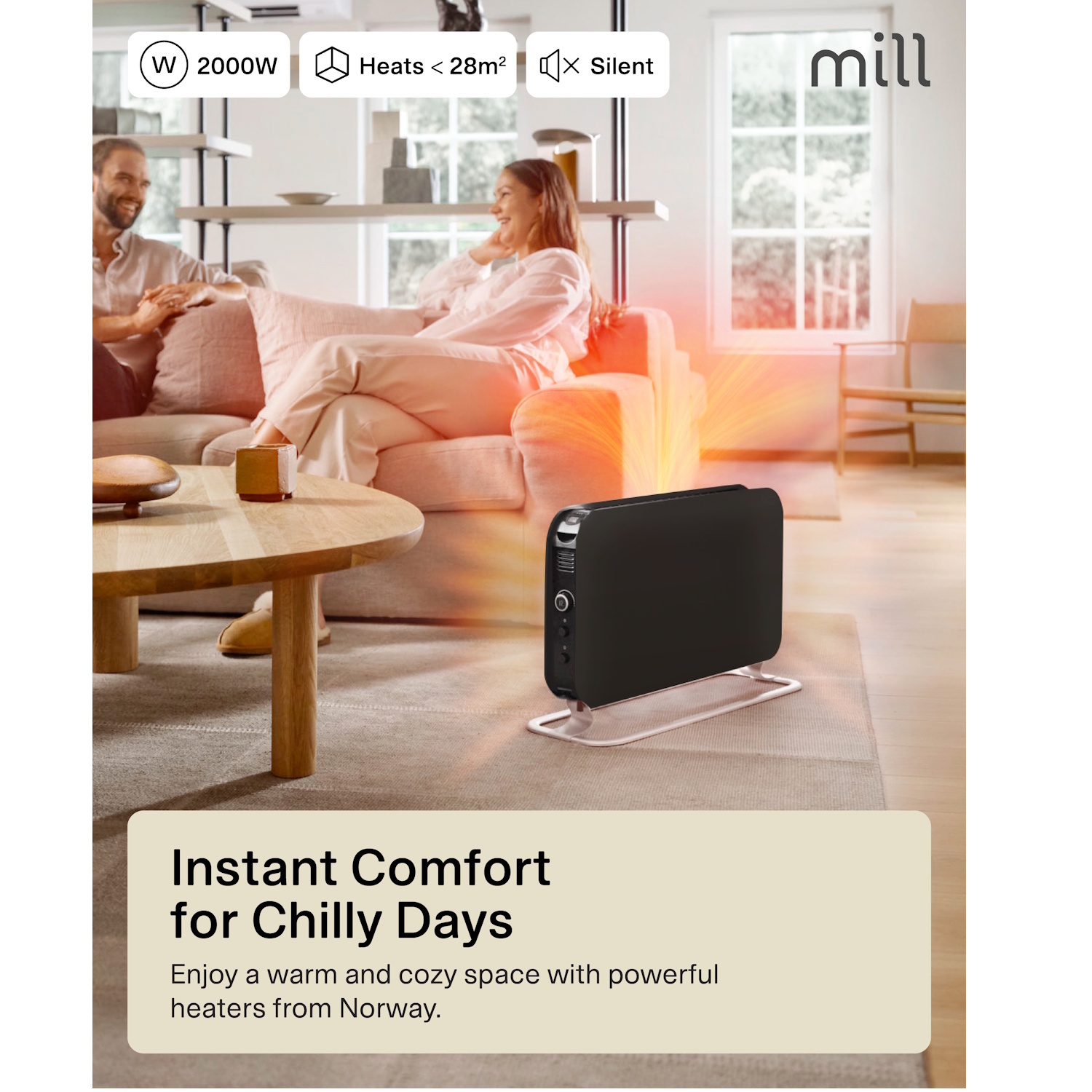 Mill – Norvegijos prekės ženklas, garsėjantis skandinavišku dizainu ir efektyviais, saugiais elektrinio šildymo sprendimais.