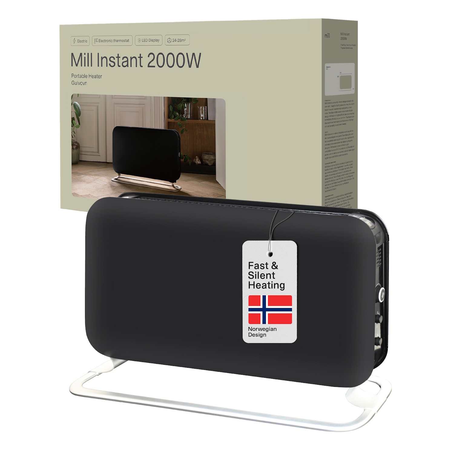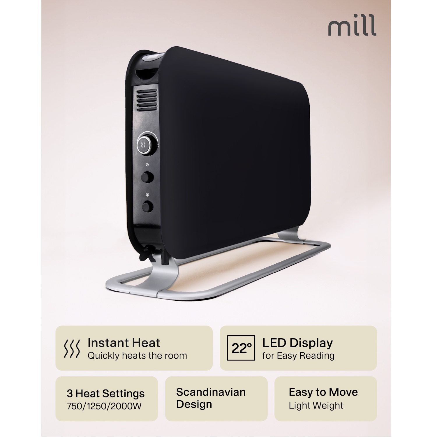 Mill SG2000LED – galingas 2000 W konvekcinis šildytuvas su trimis galios lygiais, skirtas 5–20 m² patalpoms. Modernus juodas dizainas ir LED ekranas užtikrina patogų valdymą, o konvekcinis šildymas veikia greitai ir tyliai.