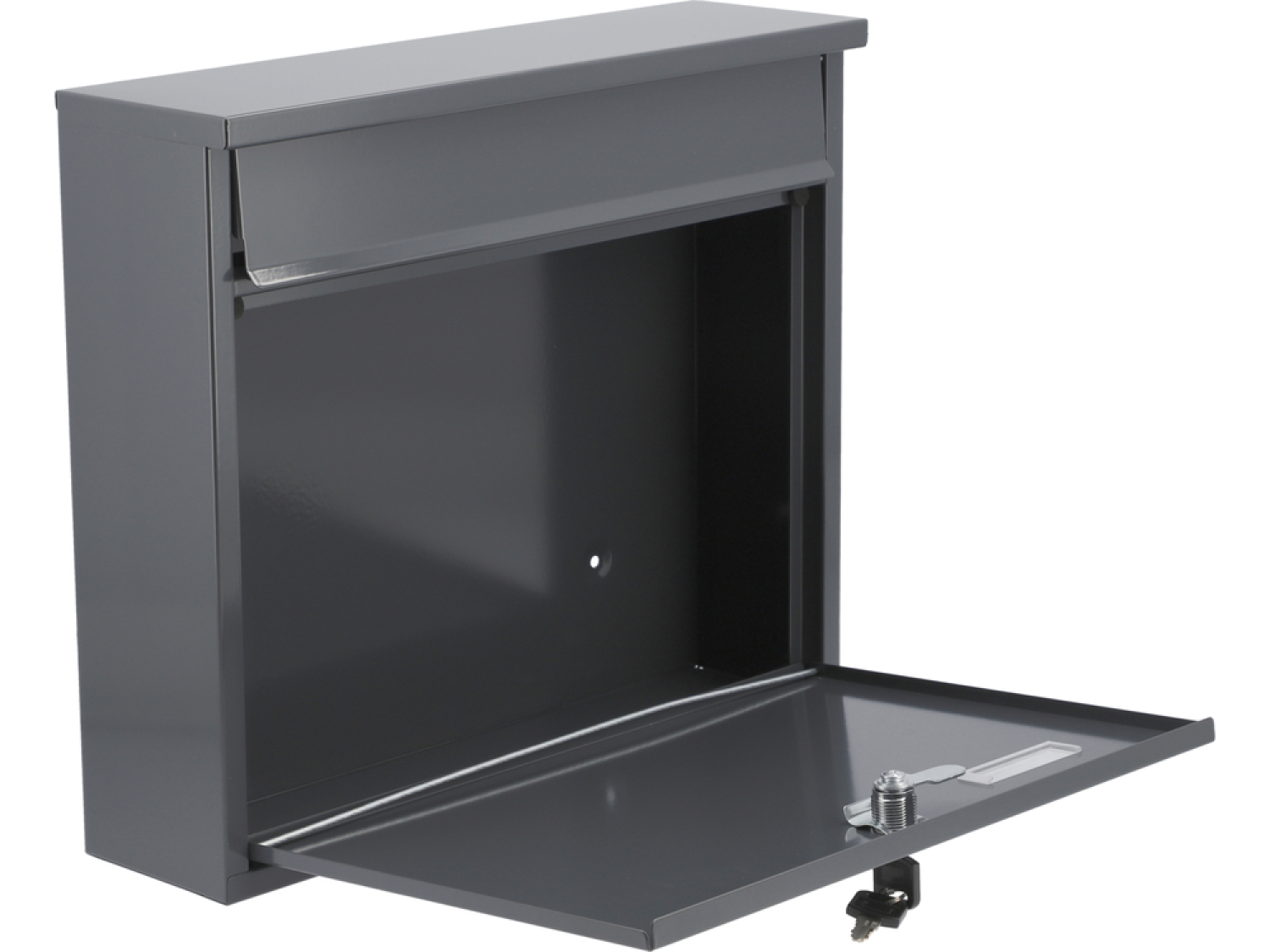 Pašto dėžutė 310x360x100mm. Pagaminta iš 0,6mm storio plieno lakšto, cinkuota pilkos spalvos. Dėžutė turi galinį angą su apsauginiu dangteliu. Priekinės durys užsidaro rakto pagalba. Komplekte yra 2 raktai. Galinėje pusėje yra montavimo skylės. Neto svoris 2.11kg