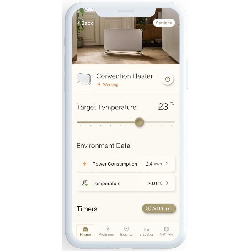 Mill CO1200WIFI3 GEN3 — это современный конвекционный обогреватель мощностью 1200 Вт с тремя режимами нагрева и встроенным WiFi-управлением. Устройство рассчитано на помещения 14–18 м² и обеспечивает быстрое, равномерное и полностью бесшумное отопление. Третье поколение (GEN3) предлагает улучшенный электронный термостат, более стабильное подключение и интеллектуальные функции, такие как планирование температуры, адаптивный подогрев и автоматическая экономия энергии. Минималистичный белый скандинавский дизайн делает обогреватель идеальным решением для современного интерьера.