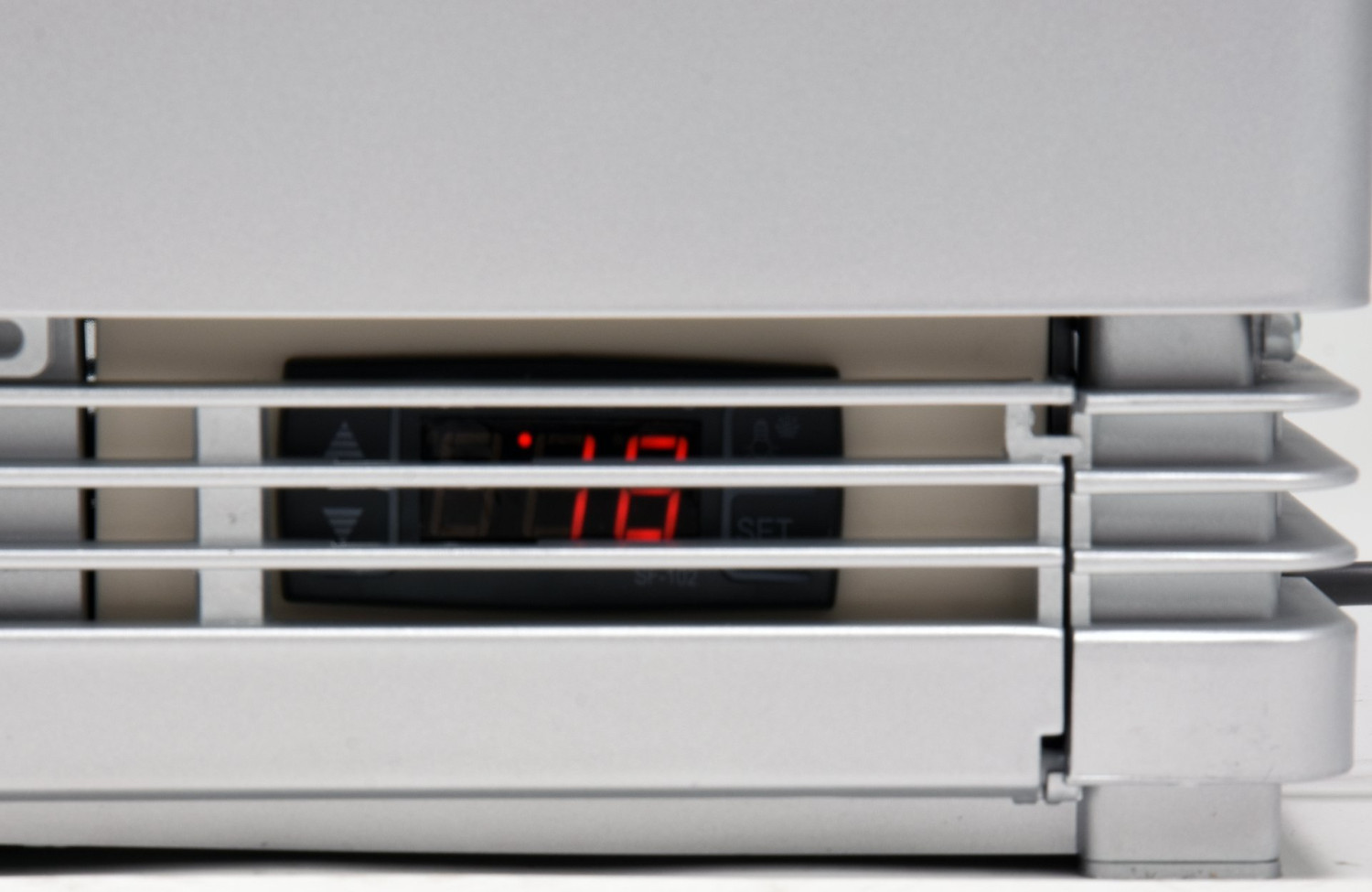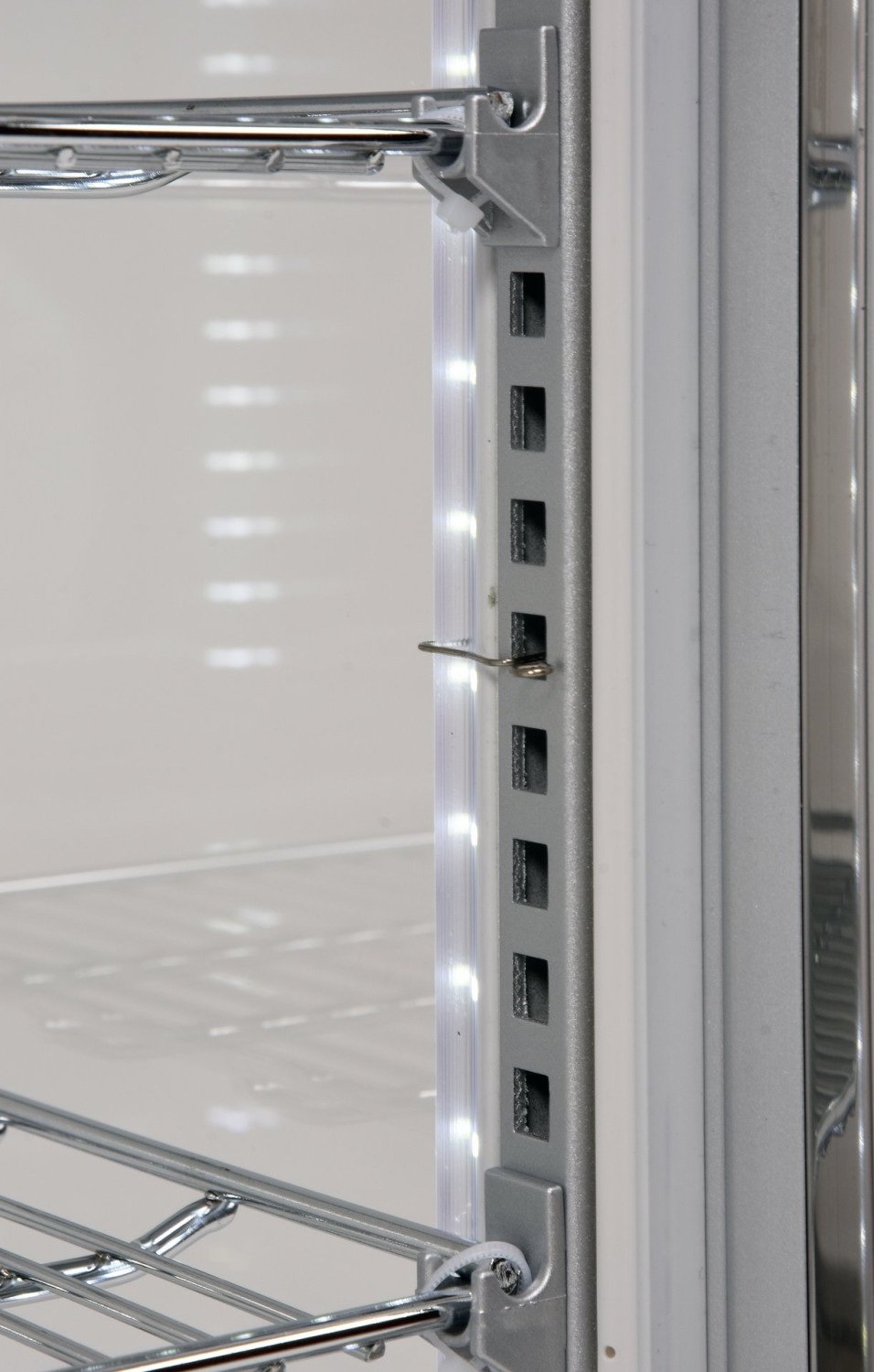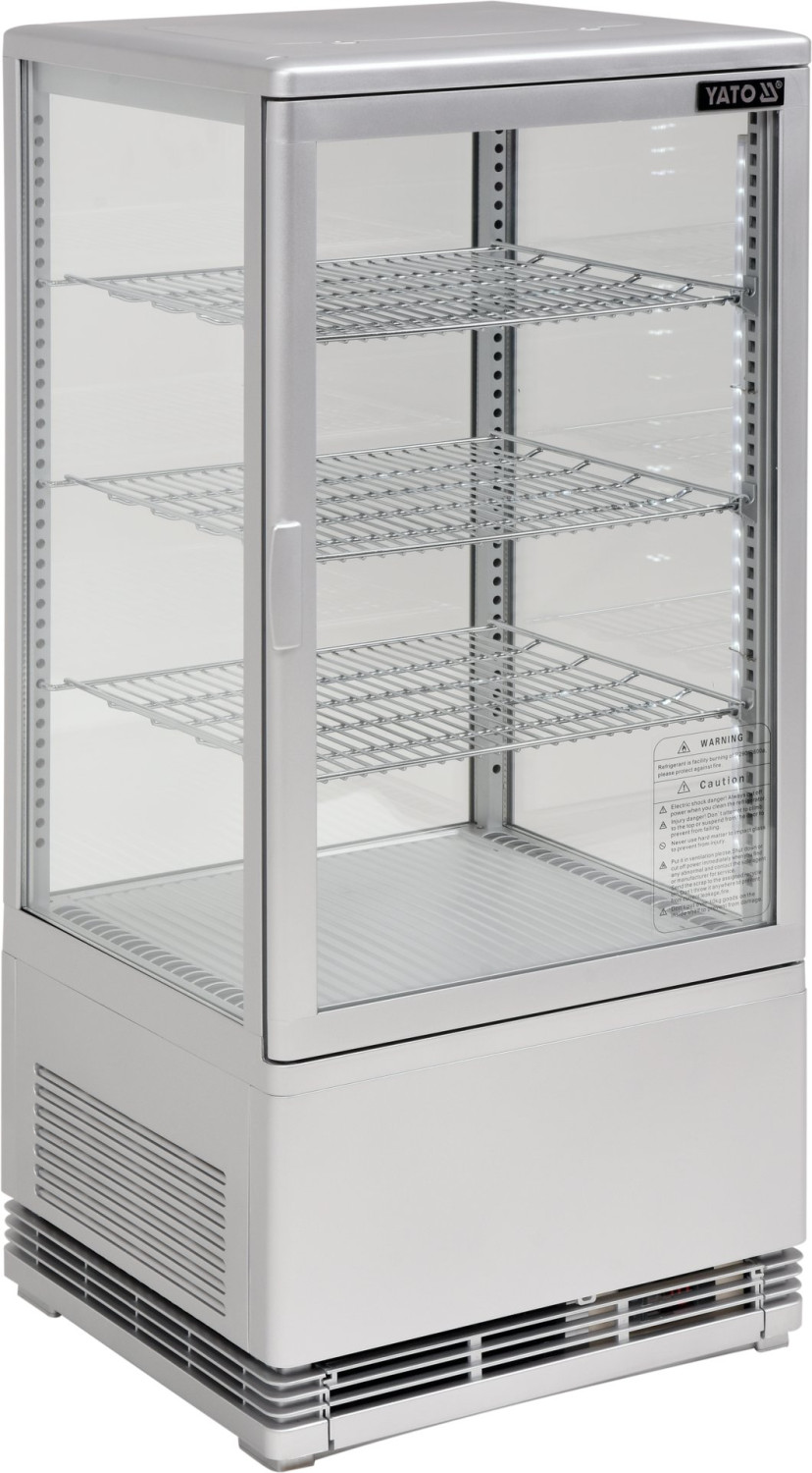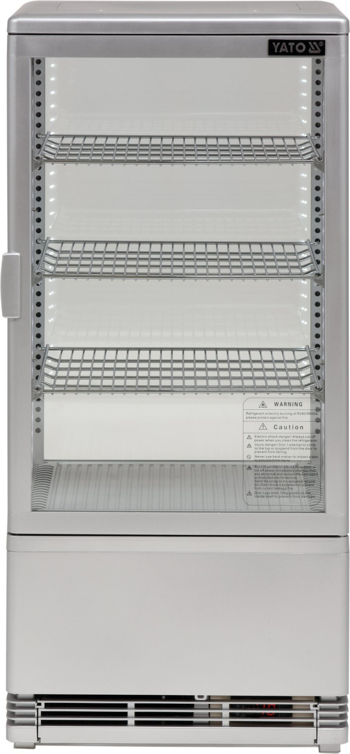 Galda vitrīna 78L, YG-05057, YATO, sudraba krāsā, izmēri 42x38x96 cm, ar LED apgaismojumu un automātisko atkausēšanu.