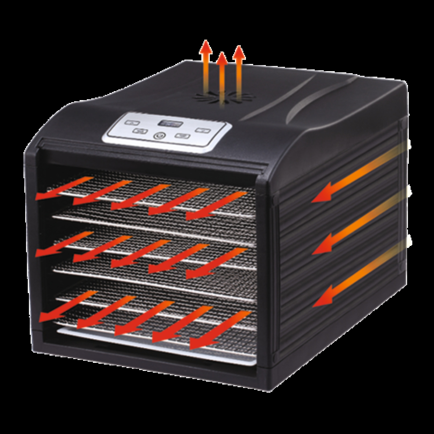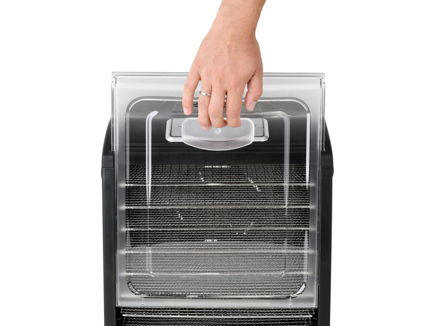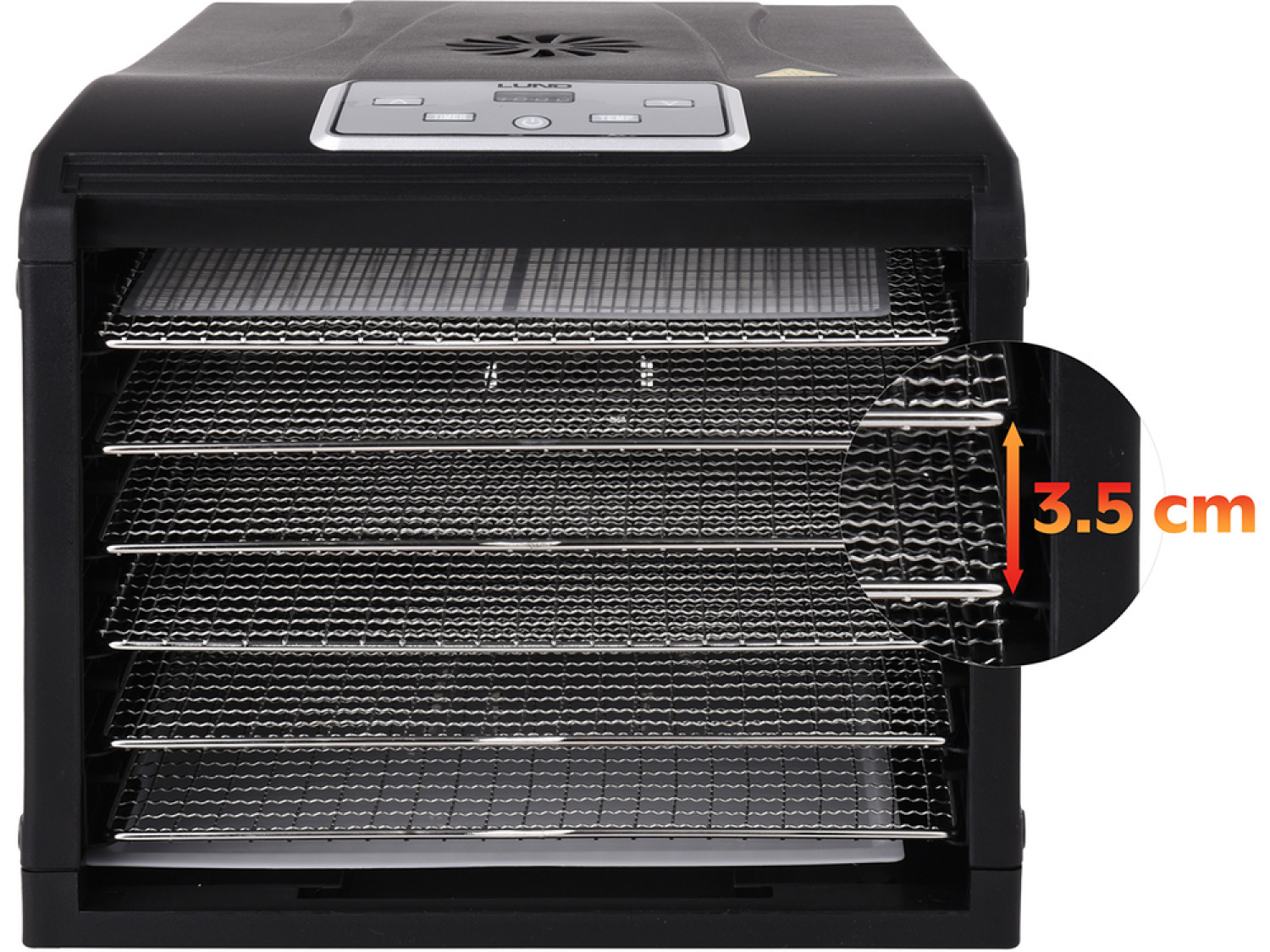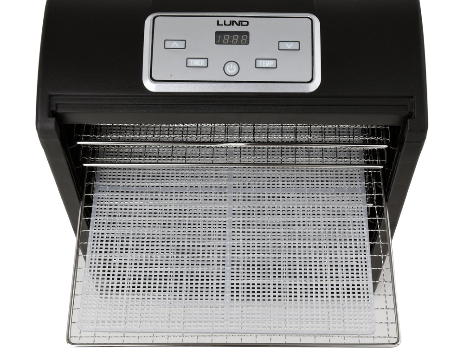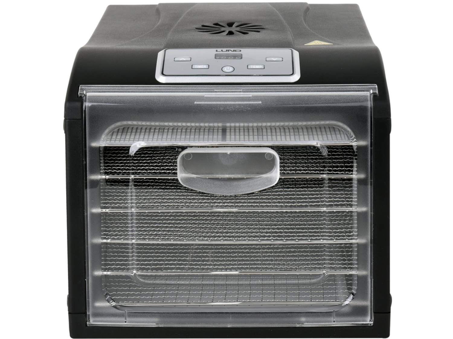 Электрическая сушилка LUND, модель 68272, предназначена для сушки продуктов питания: фруктов, овощей, грибов, цветов, трав, мяса и рыбы. Она позволяет сохранить питательные и вкусовые качества продуктов, длительно храня их вплоть до нескольких месяцев. Благодаря встроенному таймеру возможно программирование времени сушки от 0,5 до 19,5 часов. В дополнение к этому, в комплект входят аксессуары: сетка и поддон для сушки мелких продуктов, таких как травы и чай.