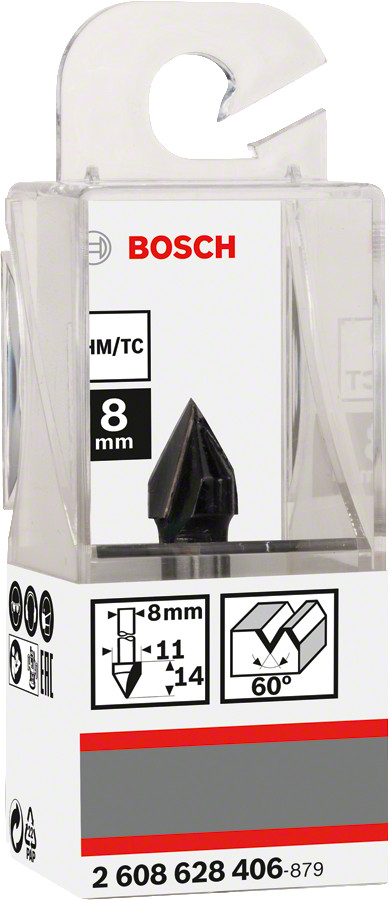 V-gropes frēze HM 60o, l=14 mm,kāts 8mm, Rokas frēzēm, malu frēzēm V VEIDA GROPJU FRĒZE STANDARD FOR WOOD V-GROOVE BIT, 2608628406, BOSCH