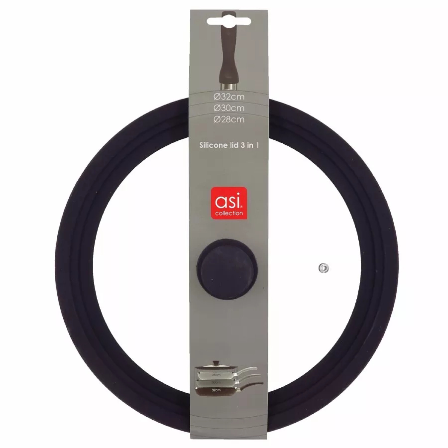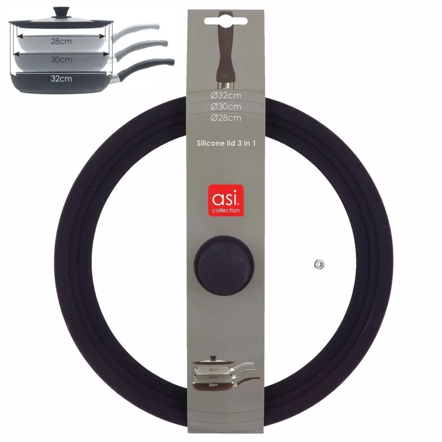Универсальная крышка из закалённого стекла с силиконовым ободом и удобной ручкой, подходит для трёх размеров кастрюль и сковородок.