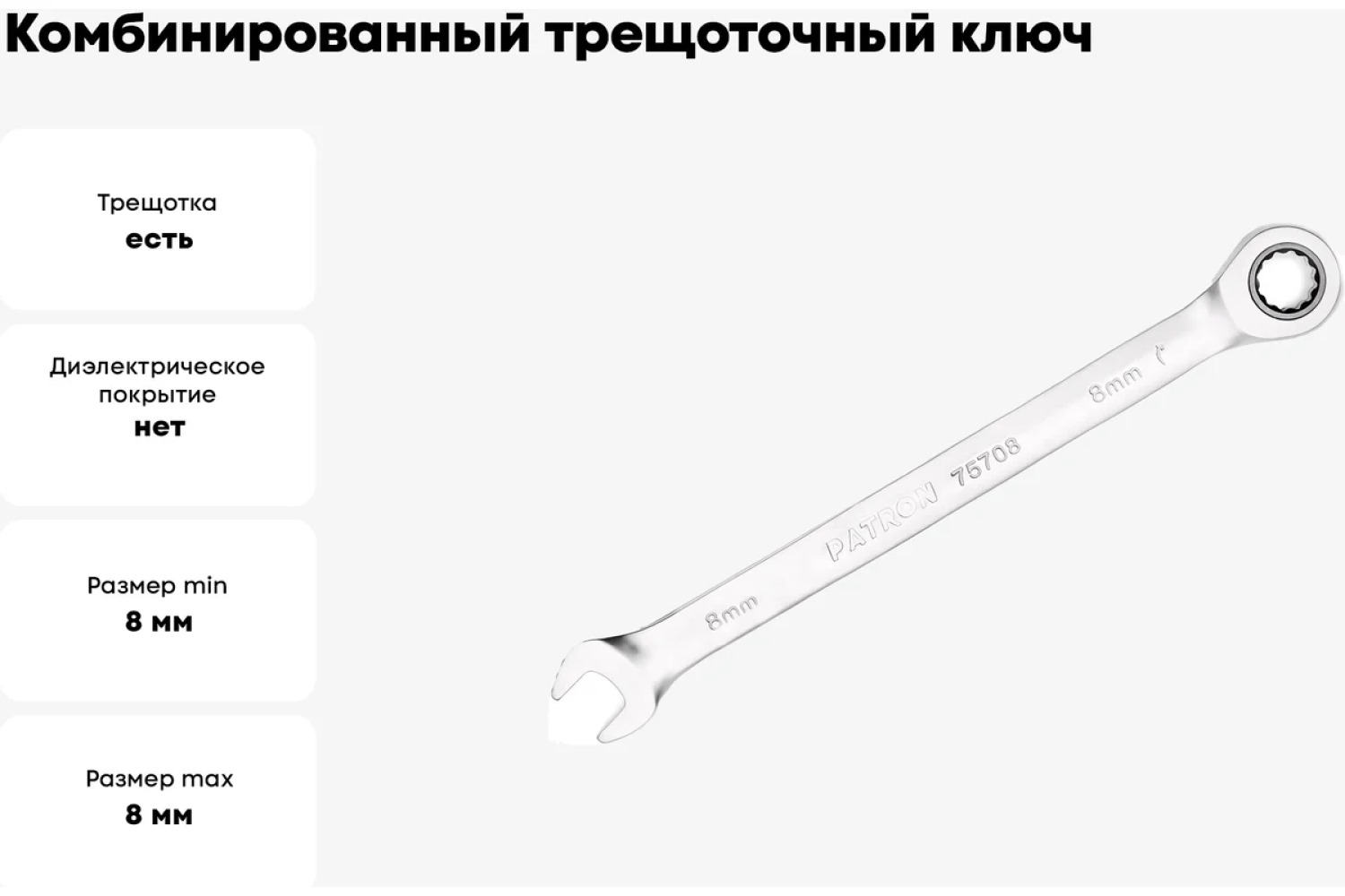 Комбинированный ключ 8 мм от бренда PATRON, модель P-75708, предназначен для профессионального и домашнего использования. Он идеально подходит для работы с различными крепежными элементами благодаря своей прочной конструкции и антикоррозийному покрытию.