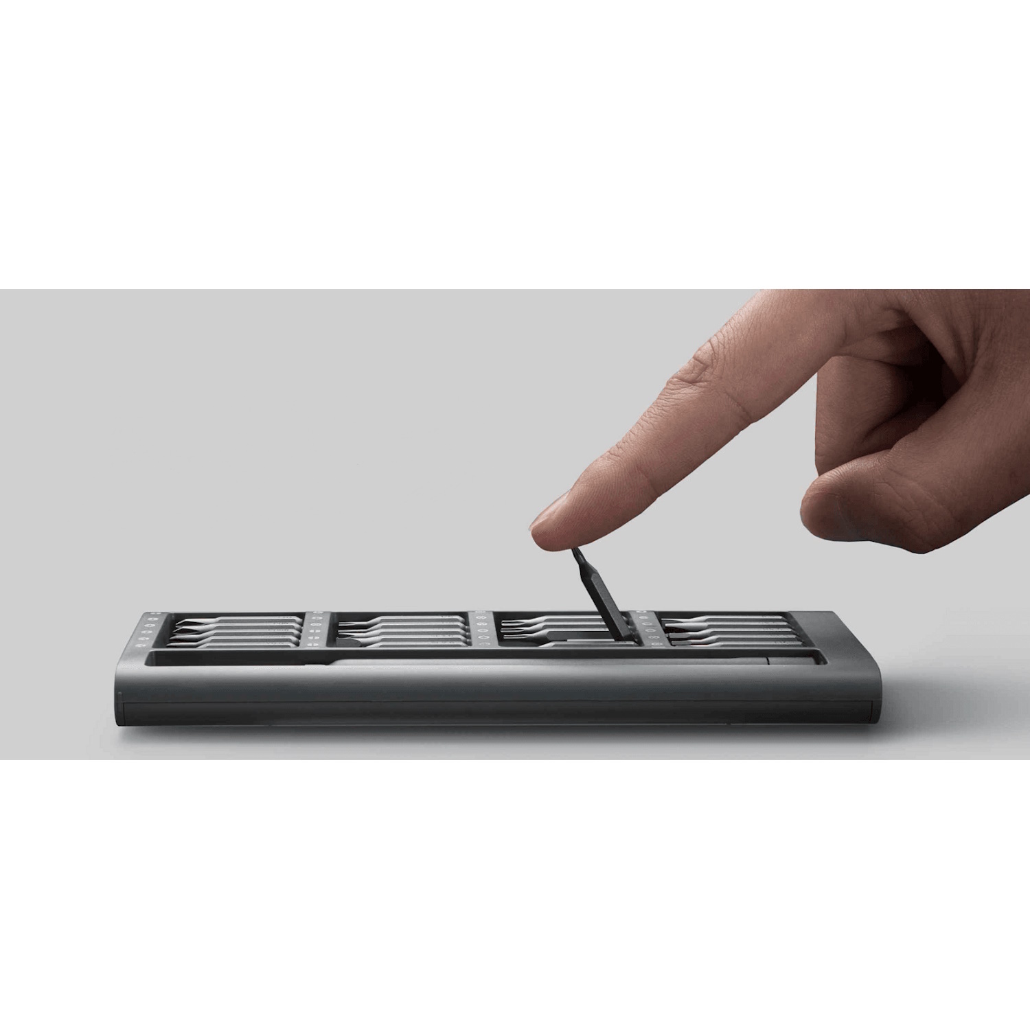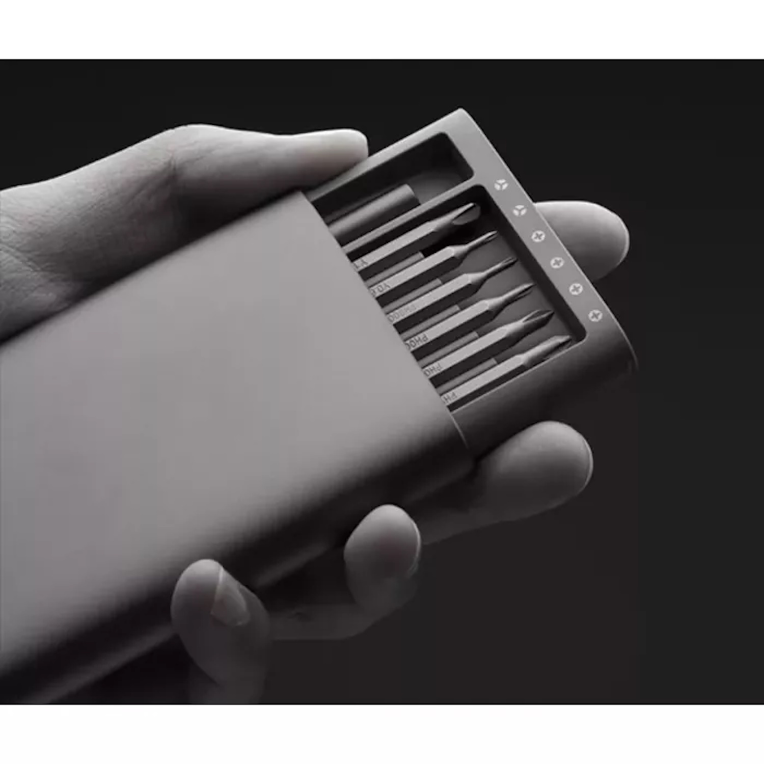 • Алюминиевый выдвижной футляр обеспечивает удобную организацию и защиту насадок, а магнитная головка отвёртки позволяет быстро и точно фиксировать микро-винты.