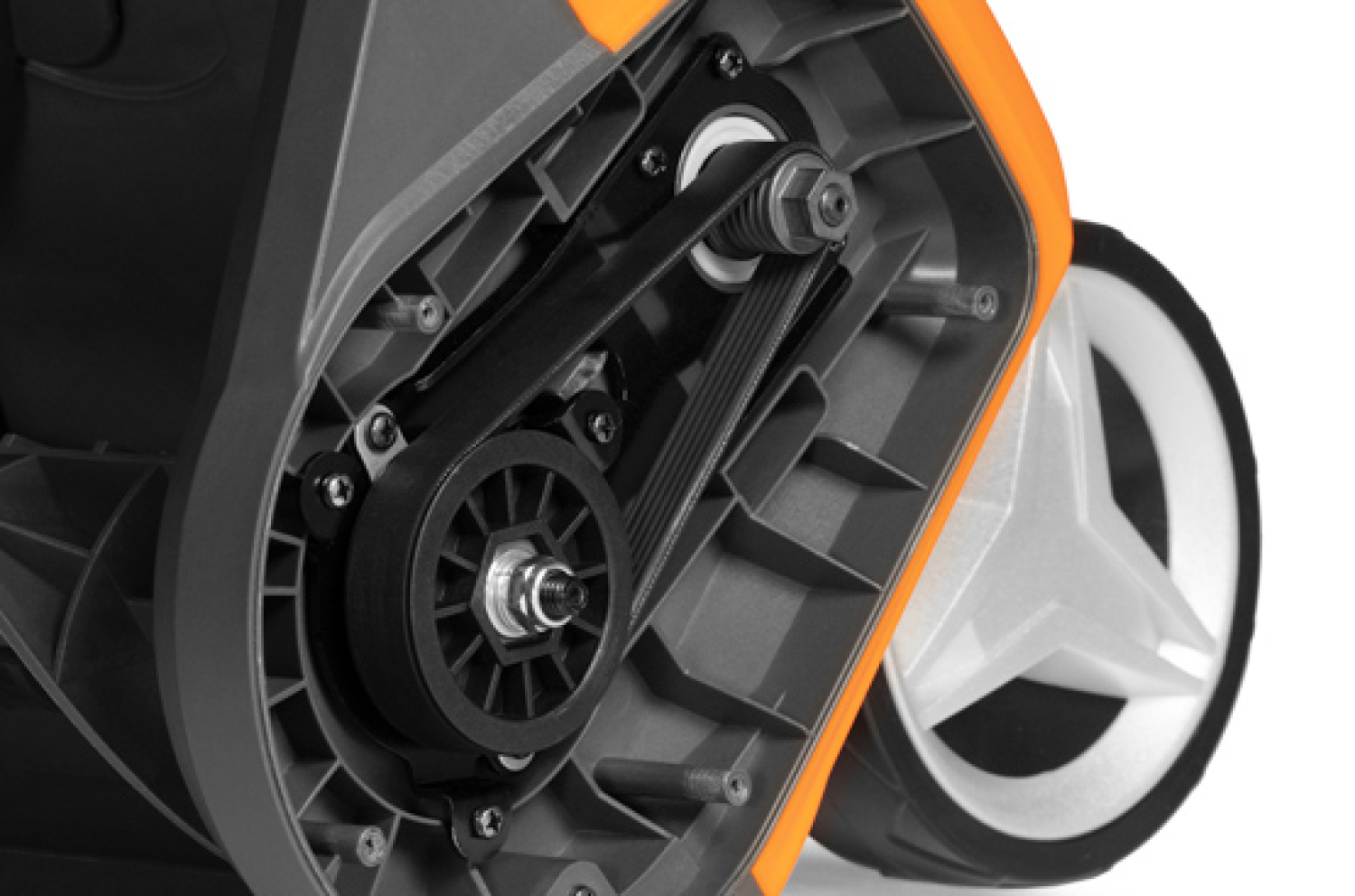 Яркий LED фонарь обеспечит освещение рабочего места во время уборки снега в темное время суток. Ременная передача