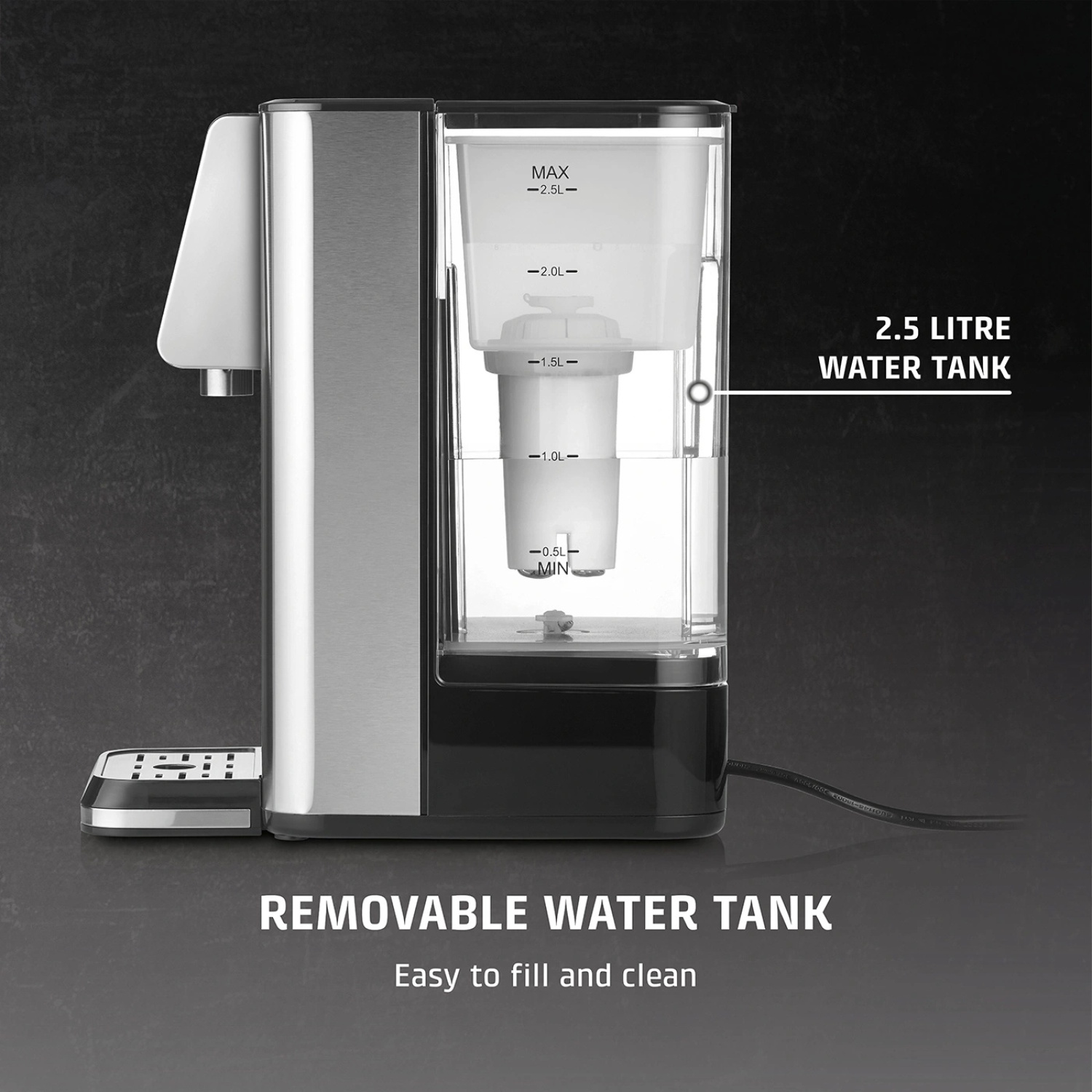 HW620 — это турбо-диспенсер для горячей воды, предлагающий совершенно новый и энергоэффективный способ быстрого получения горячей воды для повседневных нужд. Благодаря мощному нагревательному элементу 2600W и современной технологии устройство нагревает воду за считанные секунды, обеспечивая идеальную температуру для чая, кофе, быстрых супов, детского питания и ежедневного приготовления. Большой резервуар на 2.5 L, сенсорное управление Sensor-Touch и высокая температурная точность делают HW620 надёжным и удобным помощником на любой кухне. Нагревательный элемент из нержавеющей стали и качественный корпус гарантируют долговечность, стабильную работу и безопасность при длительном использовании.