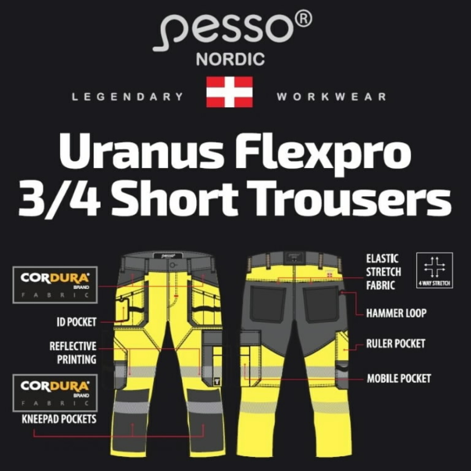 Светоотражающие 3/4 брюки PESSO KB135G_C58, идеально подходящие для работы в условиях низкой видимости. Эти брюки обеспечивают комфорт и защиту благодаря инновационным материалам.