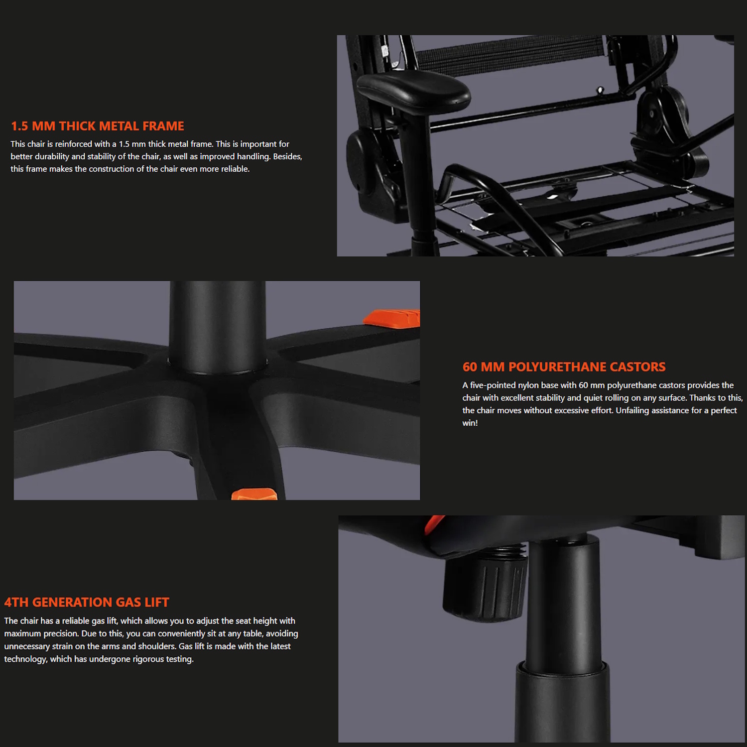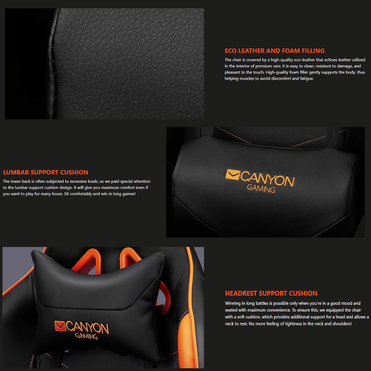 CANYON Deimos GC-4 — это эргономичное игровое кресло, предназначенное для интенсивных игровых и рабочих сессий. Оно оснащено 3D-регулируемыми подлокотниками, регулируемой спинкой 90°–165°, подушками для головы и поясницы, а также газлифтом 4 класса, обеспечивающим безопасное и стабильное использование при нагрузке до 150 кг. Черно-оранжевый дизайн придает креслу спортивный и ярко выраженный игровой характер.