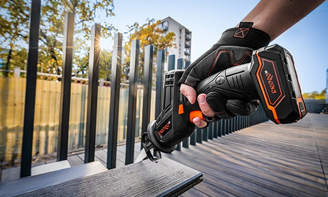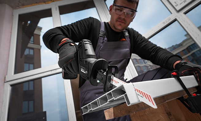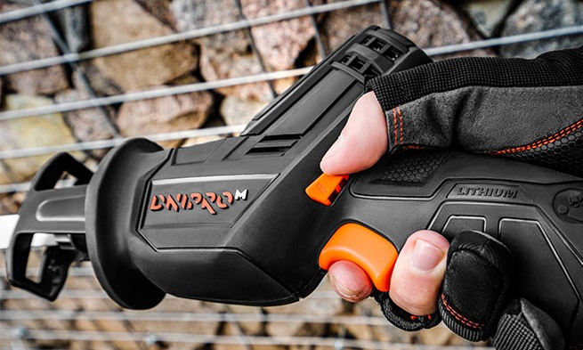 Аккумуляторную сабельную пилу удобно удерживать в руке. Рельефные вставки на корпусе и его прорезиненная поверхность улучшают сцепление с рукой оператора, защищают инструмент от выскальзывания и смягчают удар при падении пилы.